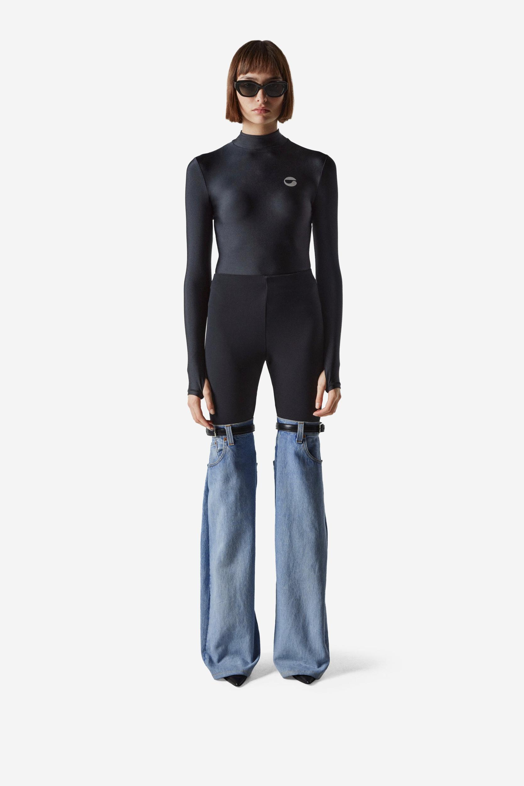 Inventive, daring and playful, these trousers are at once fusionist and futuristic. They feature stretch black jersey at the top for a smooth fit around the hips and thighs, and fall into a looser silhouette from the knees down thanks to a lower section cut from washed blue denim that pools around the ankles. Above each knee, a slim buckled belt completes this unique combination of textures and volumes.