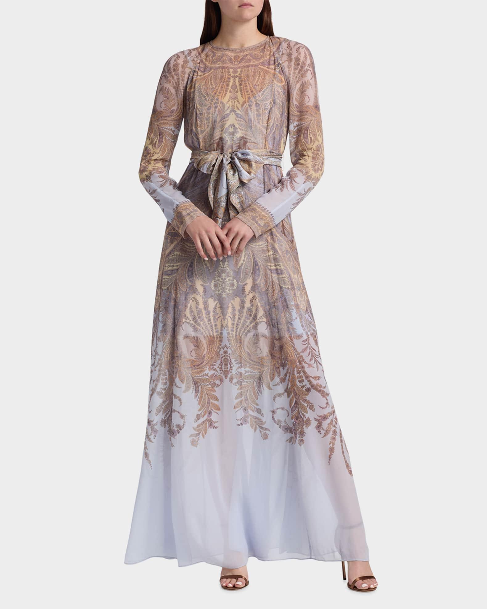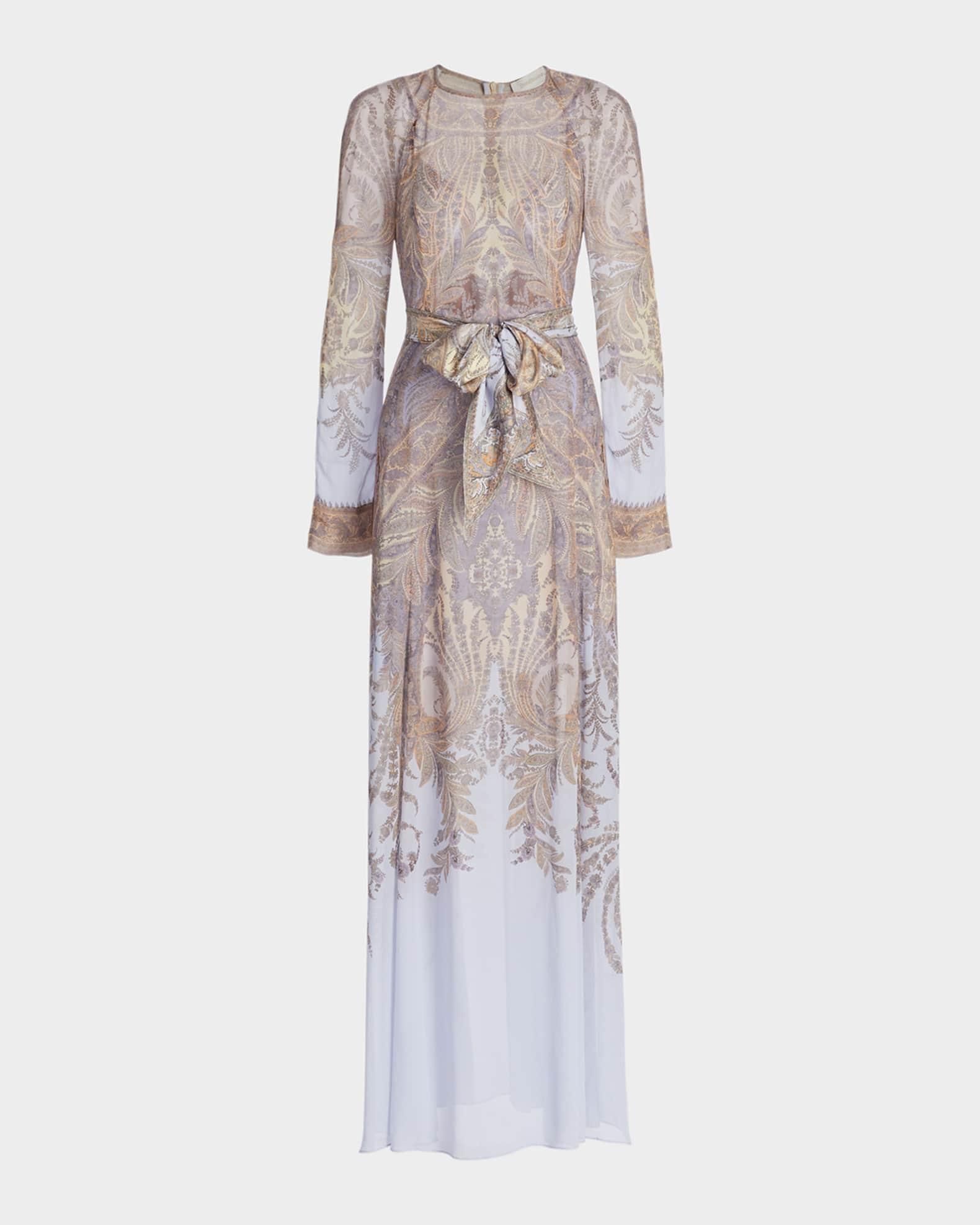 The "Hypnotic" maxi dress by Zimmermann features an intricate placement print and a removable scarf waist tie for added shape. Crew neckline Long sleeves Sheath silhouette Full length Invisible back zip Viscose/Coolmax® polyester Unlined Dry clean Imported Size conversion: 0 = X-Small, 1 = Small, 2 = Medium, 3 = Large