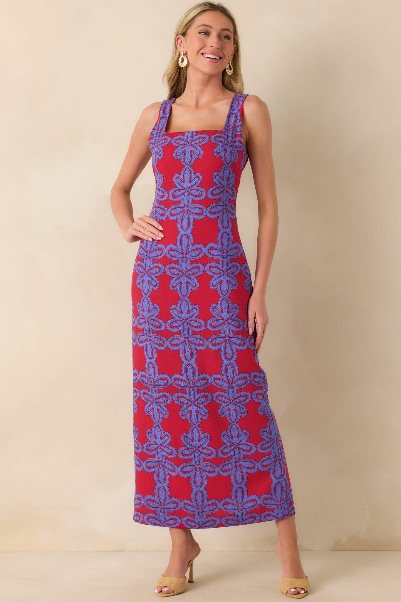 The I'm Blushing Red Multi Geometric Print Linen Blend Maxi Dress is made for the compliments you pretend not to hear but secretly love. It’s bold, feel-good, and just the right mix of playful and put-together. This maxi dress features a bright red and light indigo geometric print, square neckline, sleeveless design, hidden back zipper, full red lining, fitted bodice, and a small back center seam bottom slit.