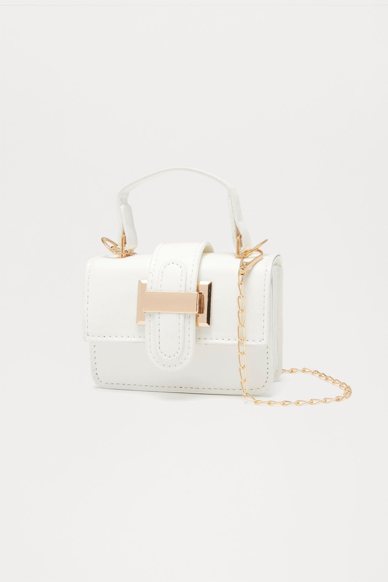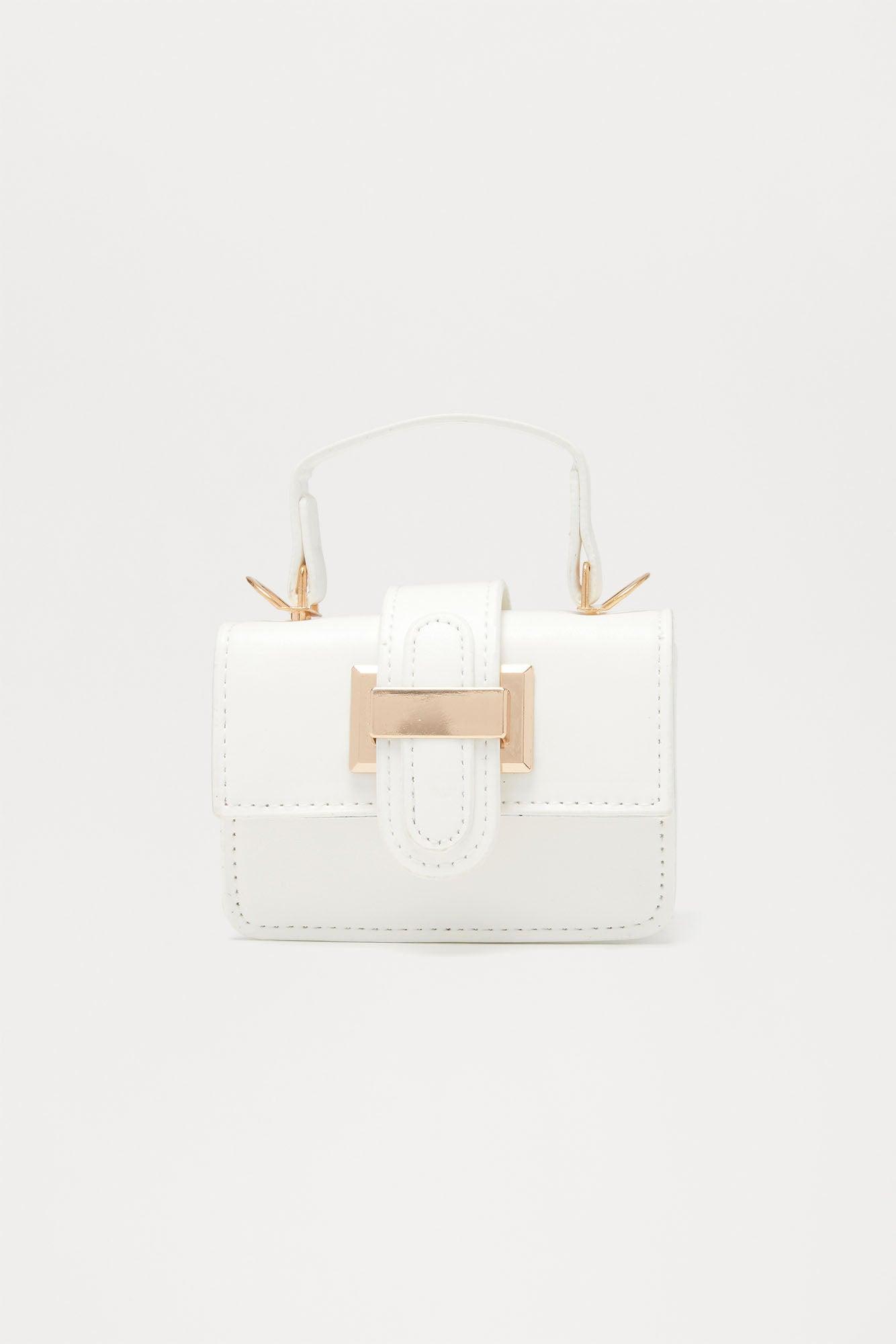 Available In White. Mini Satchel Bag Foldover Closure Faux Leather Material Metal Pull Through Detail Dimensions: 4.8''L X 1.5''D X 3.3''H Imported California Proposition 65WARNING: Cancer and Reproductive Harm - www.P65Warnings.ca.gov.
