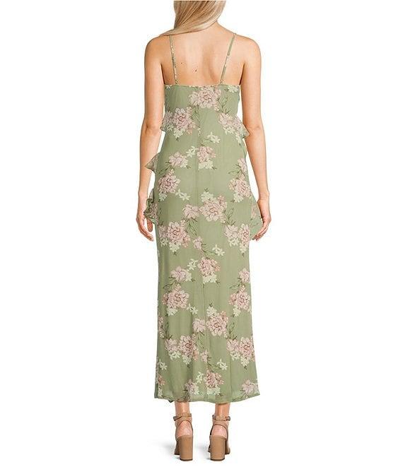From I.N. San Francisco, this dress features: Floral print V-neckline Sleeveless Spaghetti straps Maxi length Ruffles Side slit Pull-on styling 55" length Polyester/spandex Machine wash/line dry Imported.