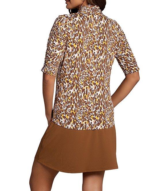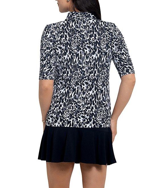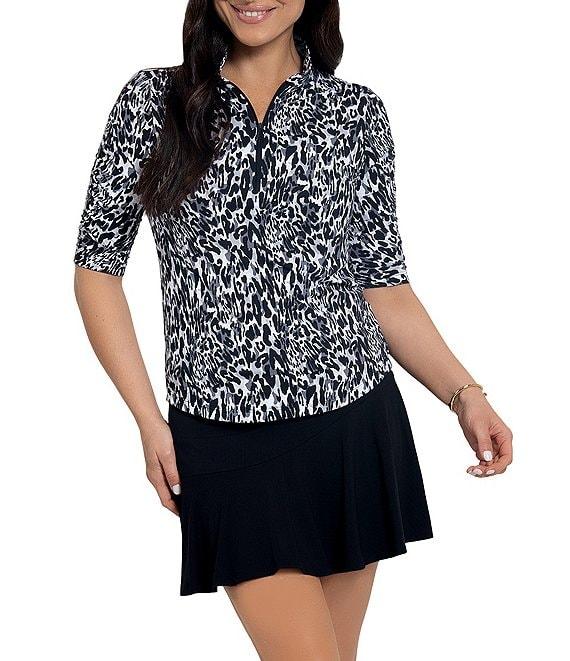 From IBKUL, this top features: Patented IceFil Cooling Technology fabrication Animal print Mandarin collar neckline Ruched elbow sleeve Pull on construction Front zip placket Shirt tail hemline UPF 50 sun-protection Moisture-wicking Anti-microbial Nylon/Polyurethane Machine wash cold, Tumble dry low Imported.