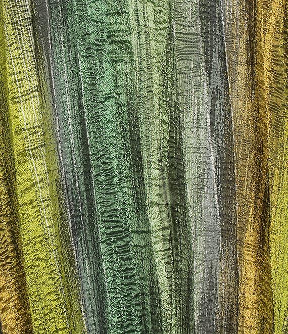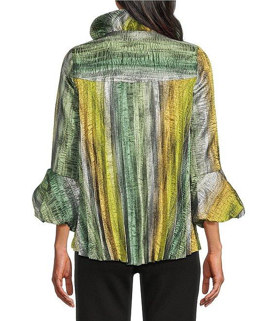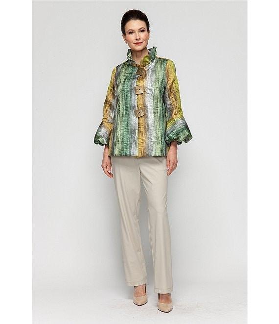 From IC Collection, this jacket features: Metallic woven fabrication Stand ruffle neckline Bracelet sleeves with puff cuffs Side pockets Straight hem Button front closure Approx. 21.5" length Polyester; lining: polyester Hand wash Made in the USA.