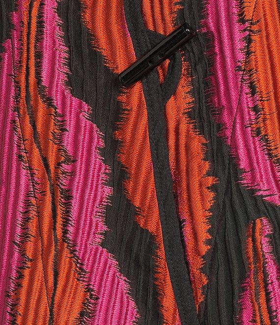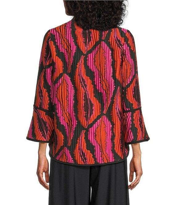 From IC Collection, this jacket features: Textured graphic jacquard fabrication High neckline Long sleeves Contrast trim Asymmetrical hem One button front closure Approx. 28.25" length Polyester/nylon Hand wash Made in the USA.
