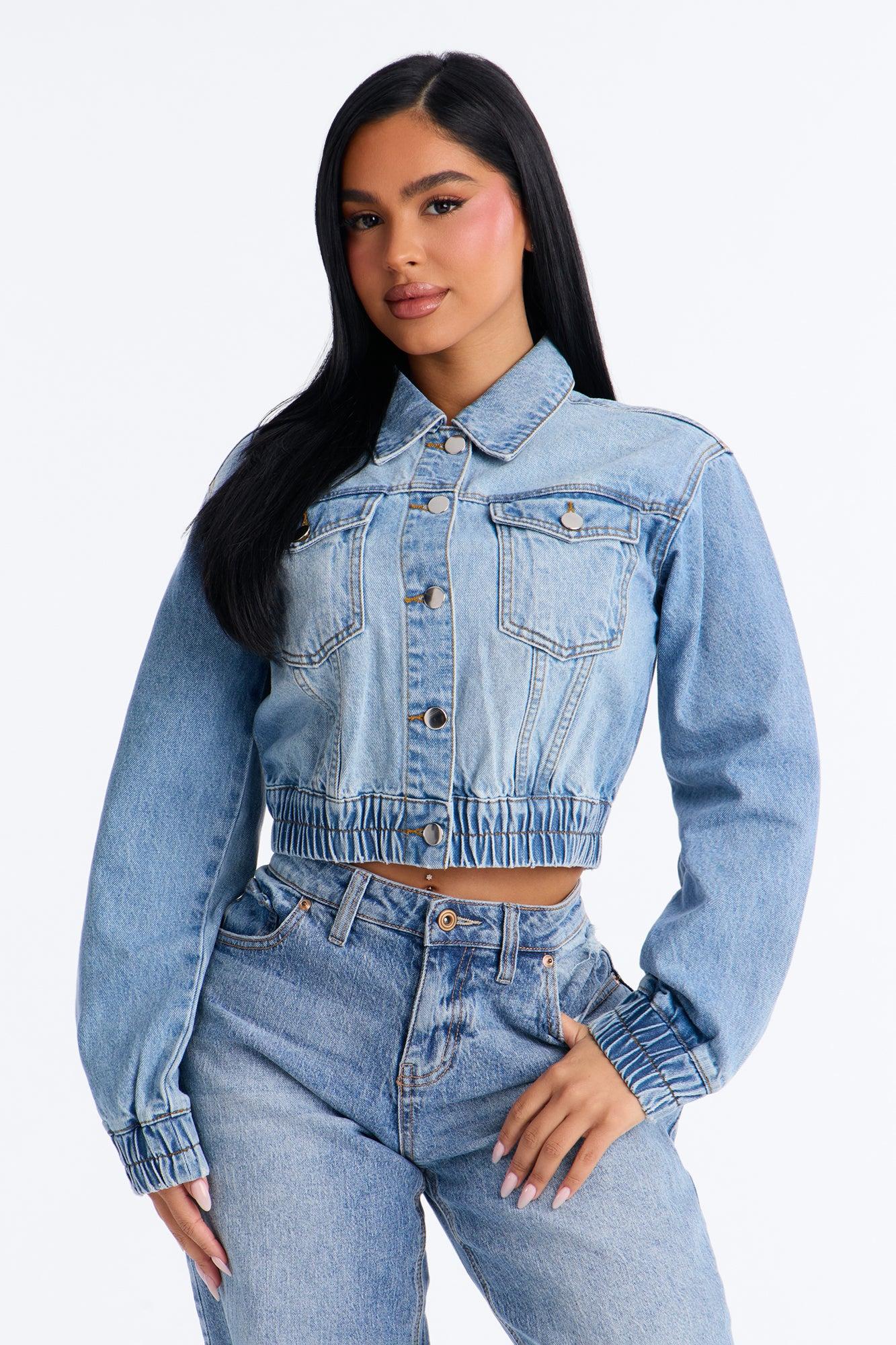 Available In Dark Wash And Light Wash. Denim Bomber Jacket Collar Long Sleeve Button Closure Chest Pockets Cropped Non Stretch Disclaimer: Due To The Specialized Wash, Each Garment Is Unique. 100% Cotton Imported
