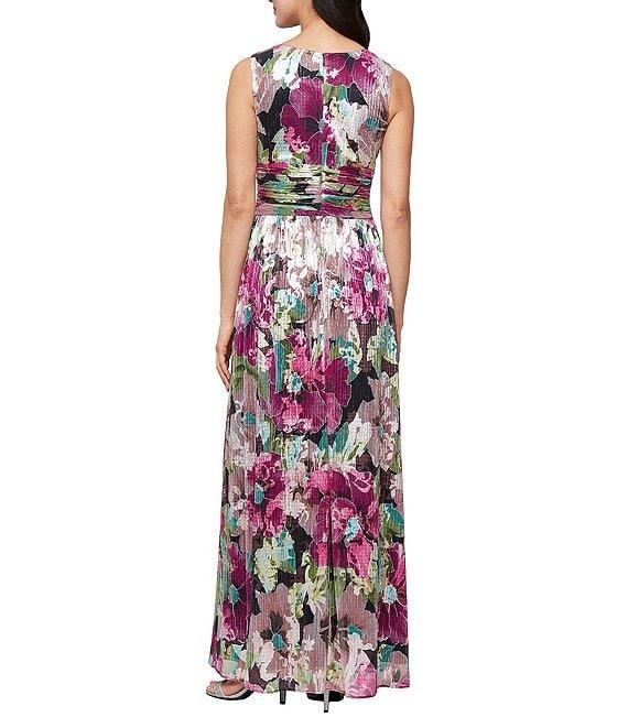 From Ignite Evenings Petite, this dress features: Foil bodre fabrication V-neckline Sleeveless A-line silhouette Lined Floral print Ruched waist Zip back closure Approx. 52" in center back length Polyester/metallic Dry clean Imported.
