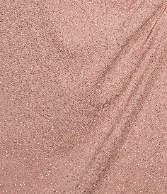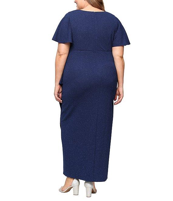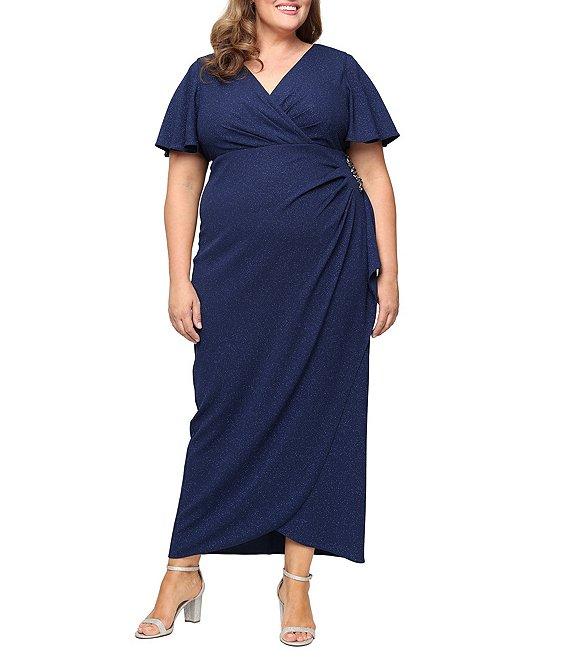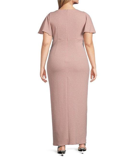 From Ignite Evenings Plus, this dress features: Glitter knit fabrication Empire waist silhouette V-neckline Short flutter sleeves Lined Embellishment detail at hip Center back zipper closure Approx. 50" length Polyester/spandex Hand wash Imported.