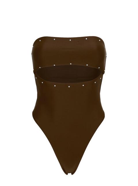 Cut-out one piece swim Stud detail, bandeau style, silicone lining inside bust, removable padding, high leg cut Good-stretch material, fully lined Princess Polly Lower Impact Main & lining: 80% reclaimed nylon 20% spandex Rinse in cold water before and after wear