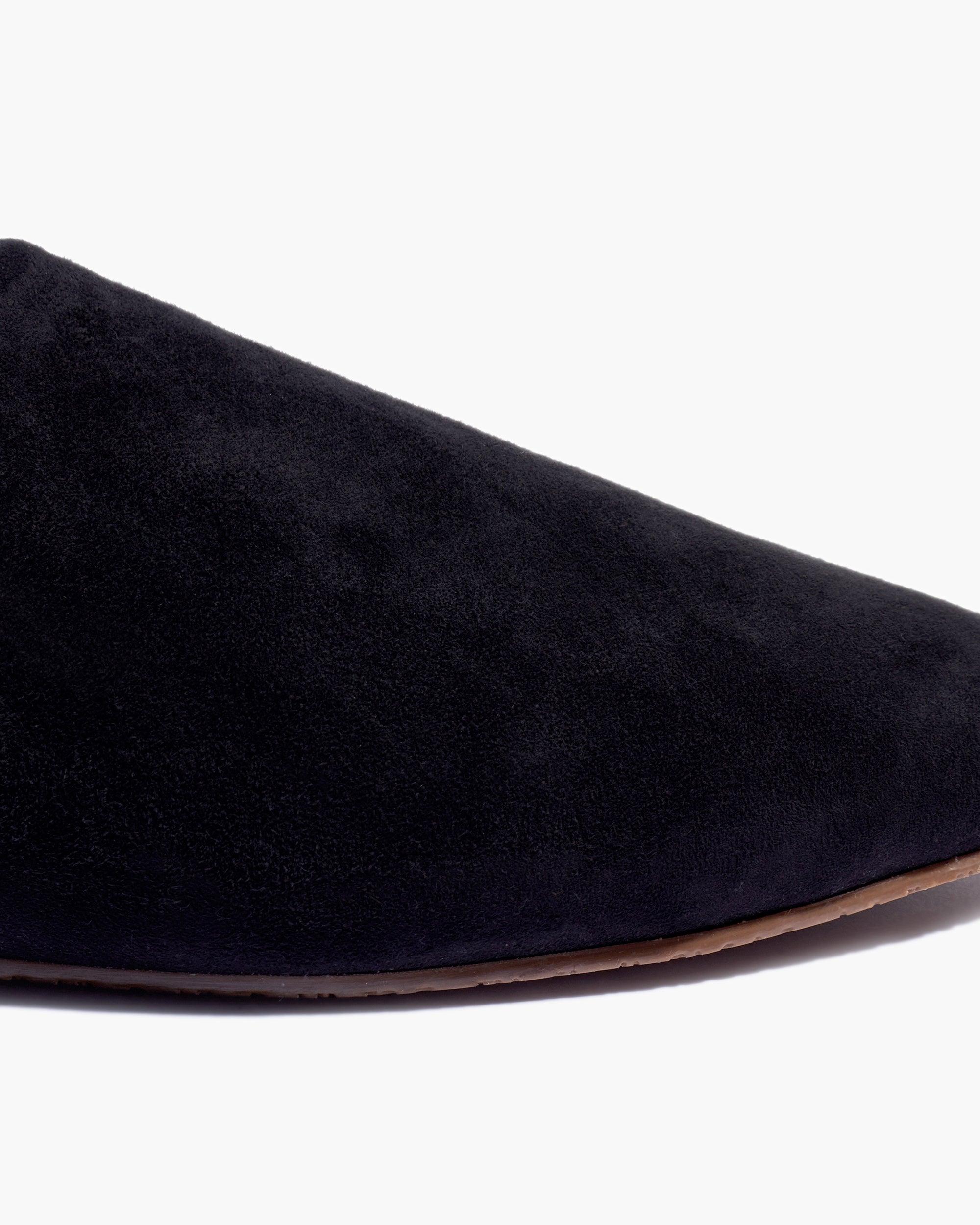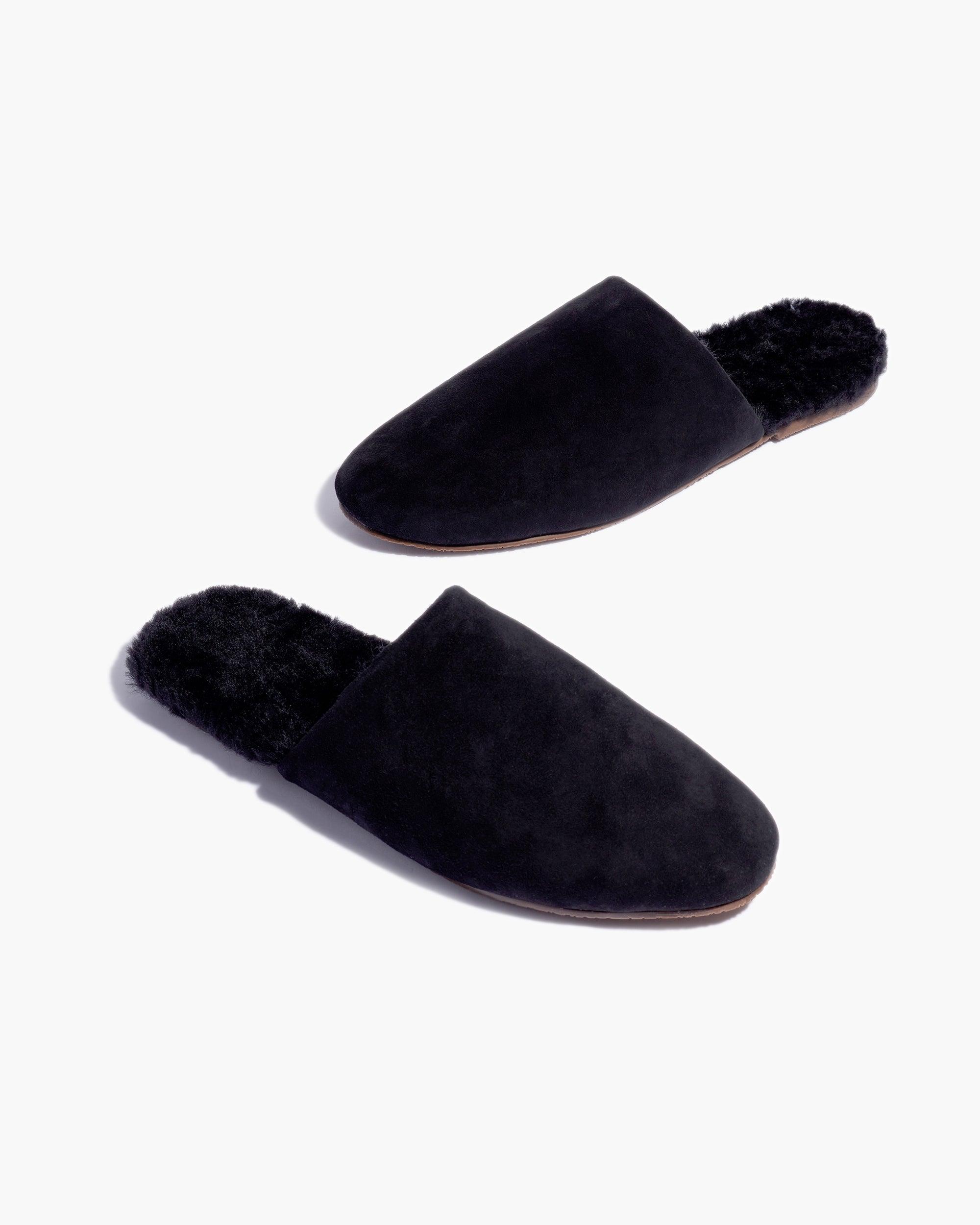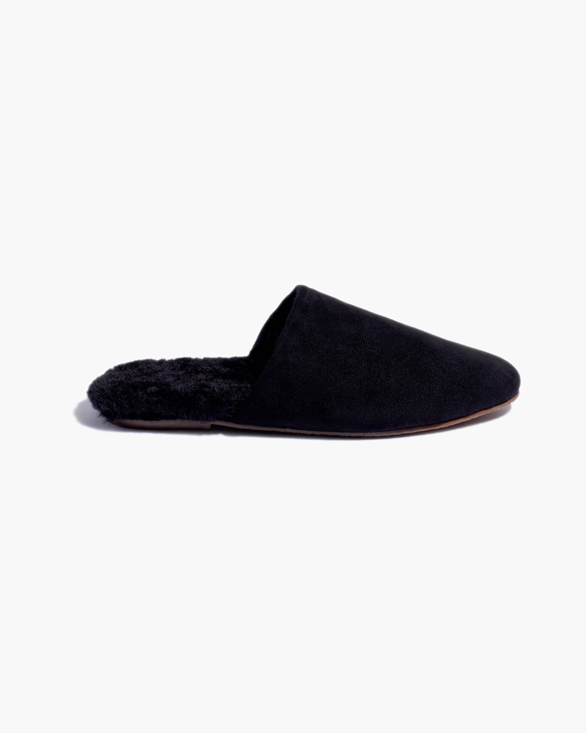 The Ines, just cozier. Slide-on mule design and made with buttery soft suede leather in rich colorways. A closed almond-shaped toe and open back are met with a shaggy 100% shearling insole and rubber outsole.