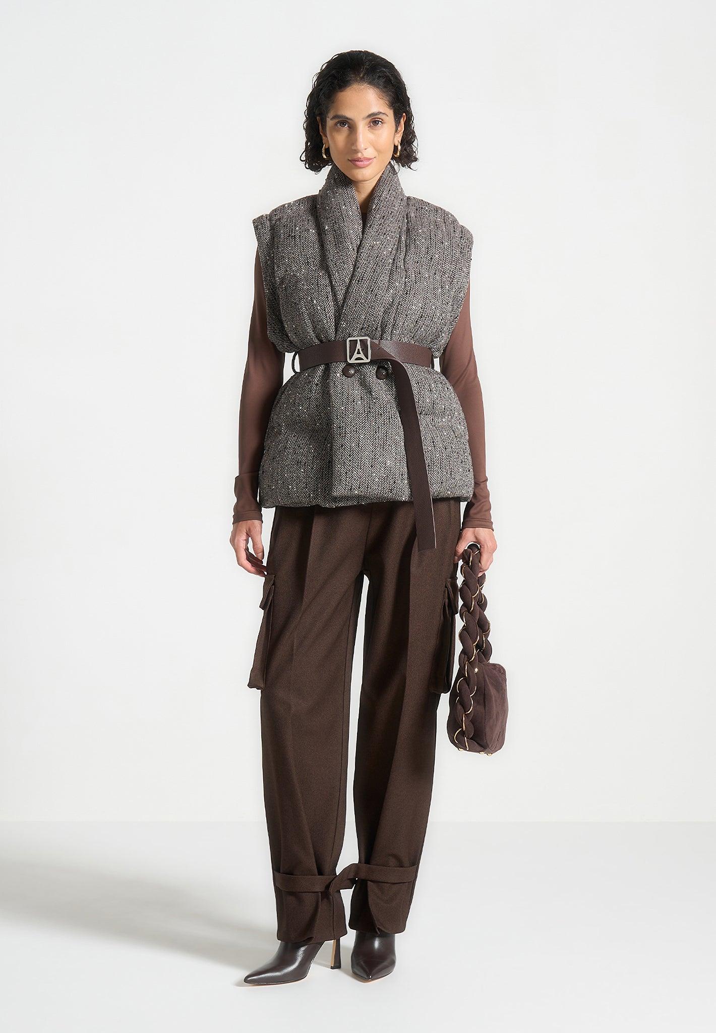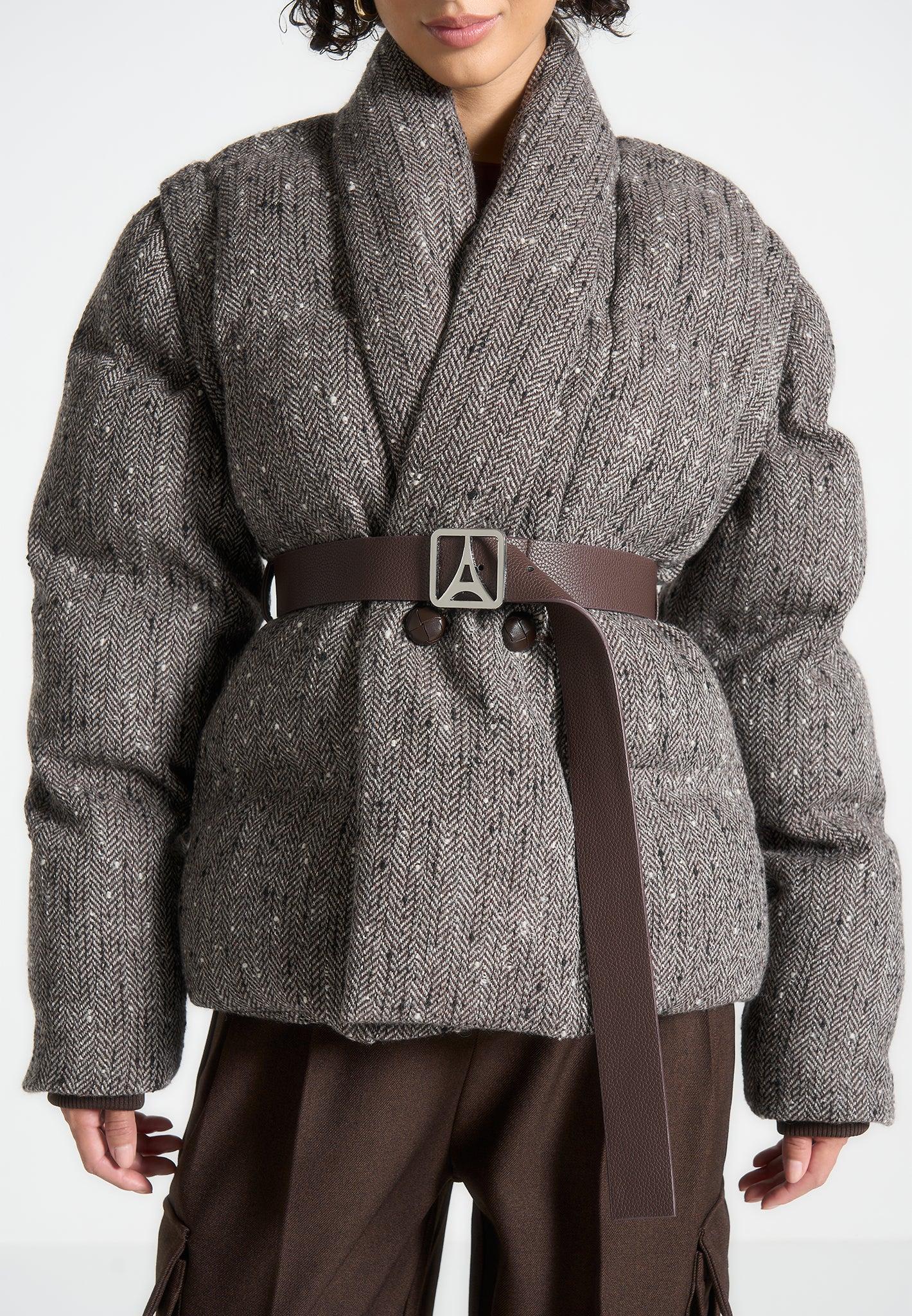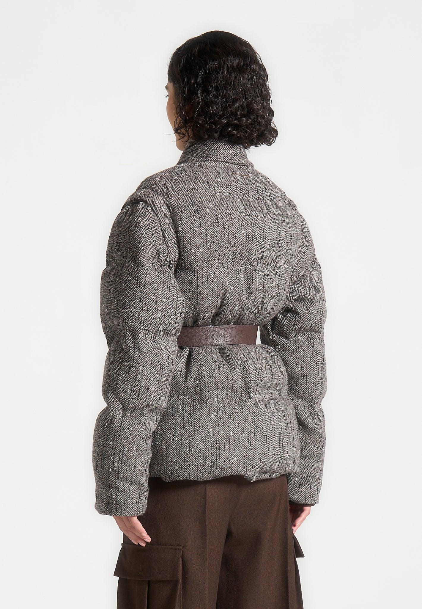 This piece reimagines outerwear with a refined mix of structure and versatility. Cut in a wrap puffer coat silhouette, it’s crafted from textured herringbone wool for an elevated finish that balances warmth with style. The detachable vegan leather belt, detailed with a silver Eiffel buckle, cinches the waist for definition while adding a signature accent. Removable sleeves allow for adaptable styling, transitioning effortlessly between looks. Finished with practical side slip pockets, it brings both function and bold structure to cold-weather dressing. Crafted from herringbone wool fabric for a textured, elevated finish Wrap puffer coat silhouette for a bold, structured look Removable sleeves for versatile styling options Detachable vegan leather belt with silver Eiffel buckle for a signature touch Side slip pockets for functionality Silver Manière De Voir branding to centre back