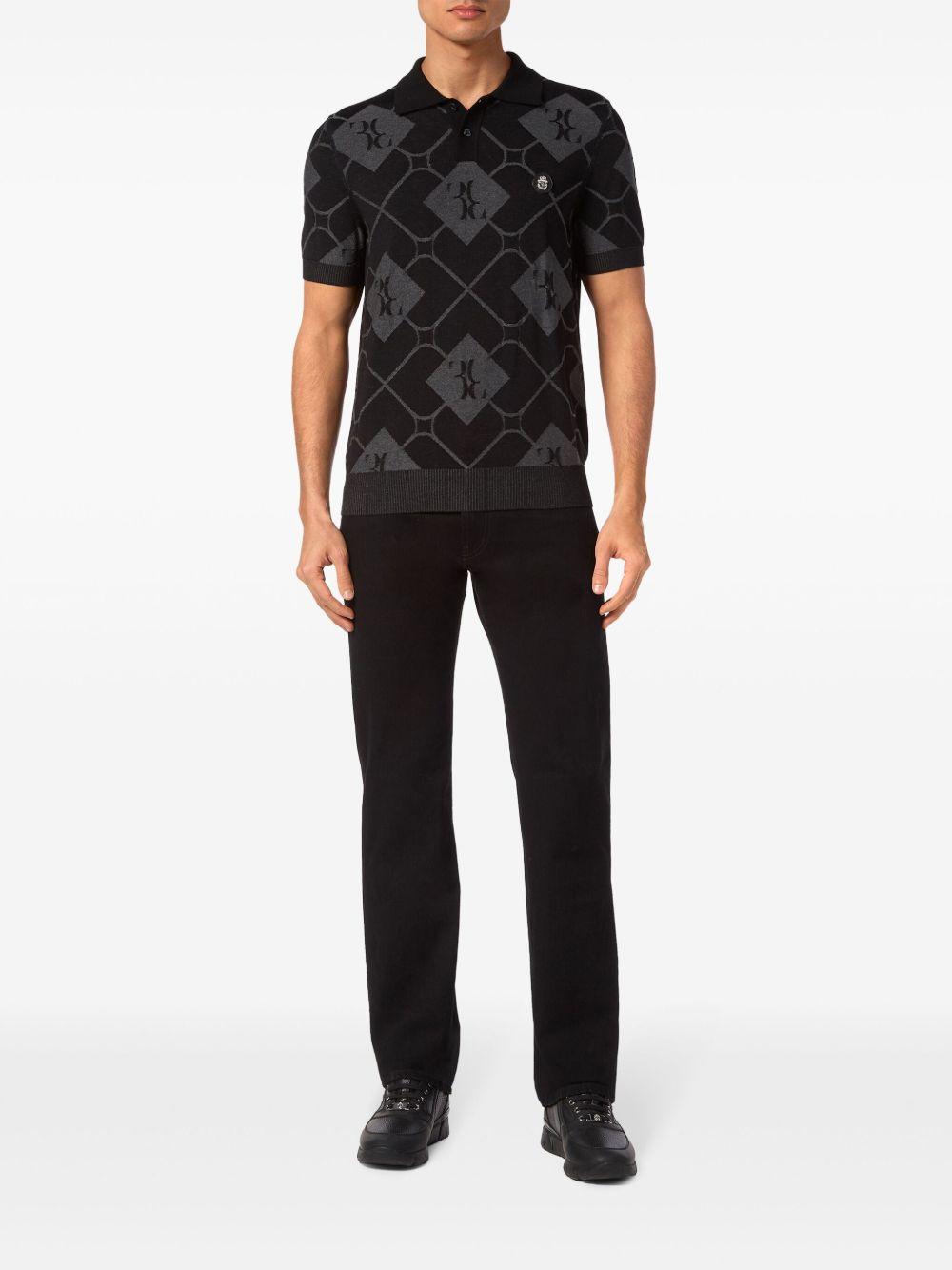 Billionaire intarsia-knit polo shirt | Black | black | wool-silk blend | knitted construction | intarsia-knit logo | appliqué logo | polo collar | front button placket | short sleeves | straight hem | Wool/Silk | Polo Shirts | Clothing | Men