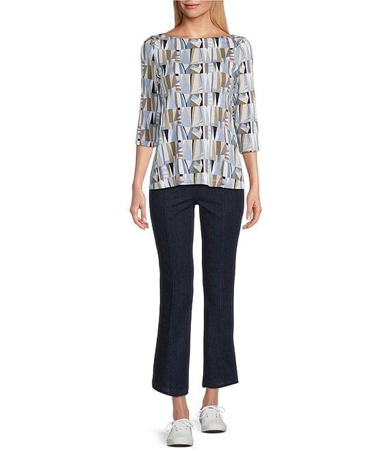 Intro Petite Knit Jersey Sand Geometric Print Boat Neck 3/4 Sleeve Tee