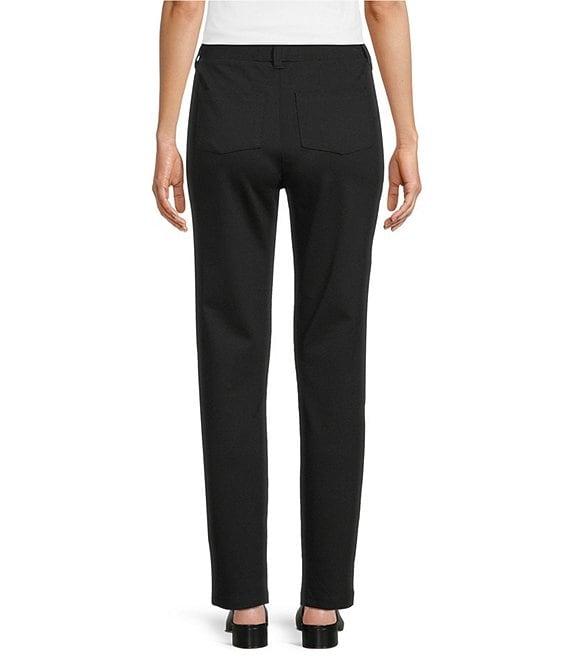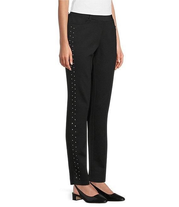 From Intro, these pants feature: Double knit fabrication Straight leg silhouette Flat front silhouette Elasticized waistband Faux front pockets Functional back patch pockets Crystals detail Straight hem Pull-on construction Approx. 30" inseam Rayon/nylon/spandex Machine wash Imported.