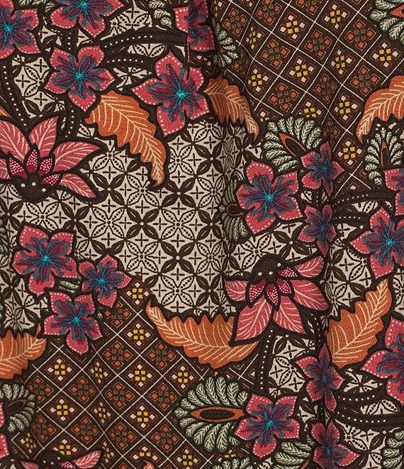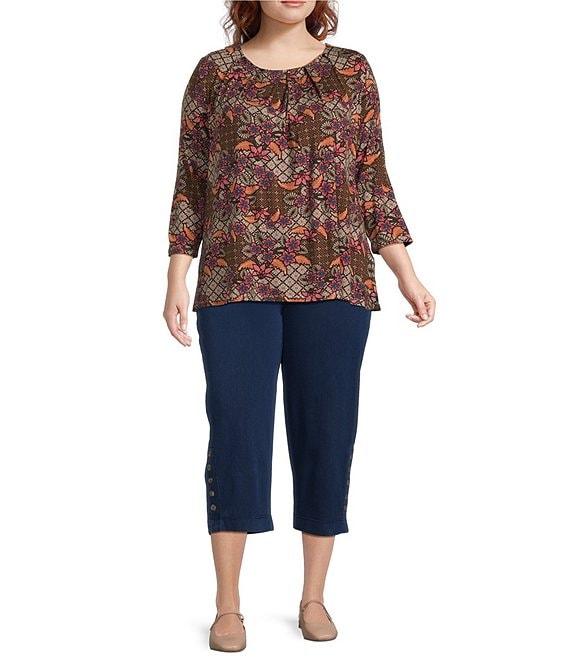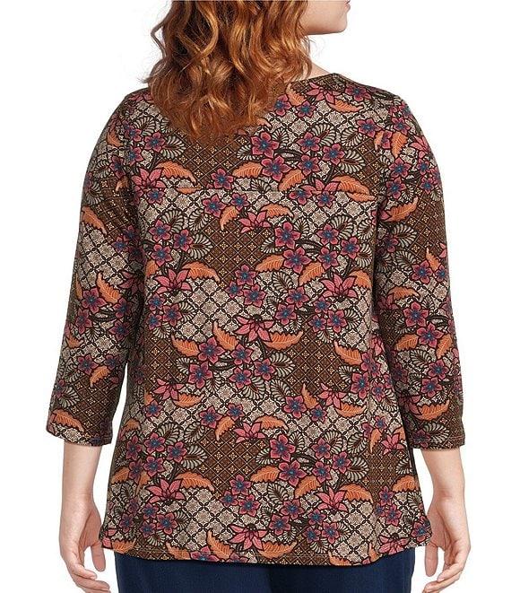 Intro Plus Size Knit Jersey Beaujolais Floral Batik Print 3/4 Sleeve Pleated Neck Tee