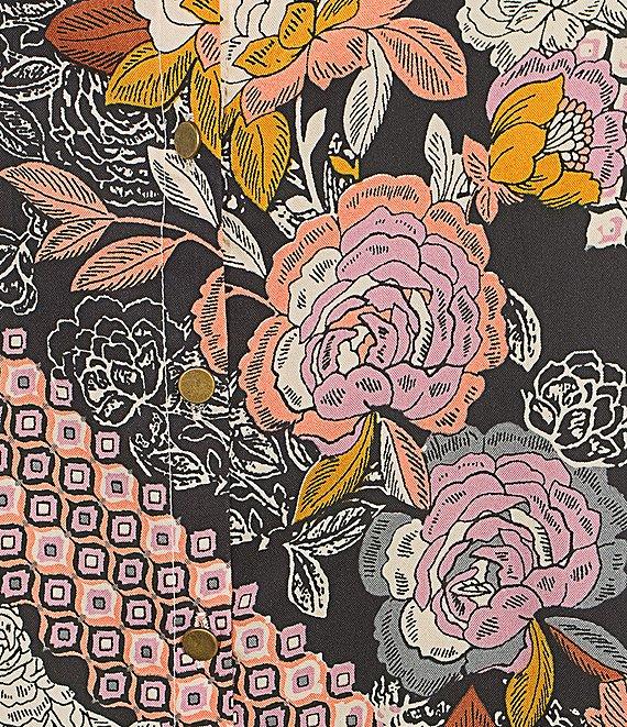From Intro, this shirt features: Soft puckered fabrication Split round v-neckline 3/4 sleeves with cuffs Patch floral print Easy drape Straight hem Button-front closure Approx. 29.5" length from center back Rayon Machine wash / line dry Imported.