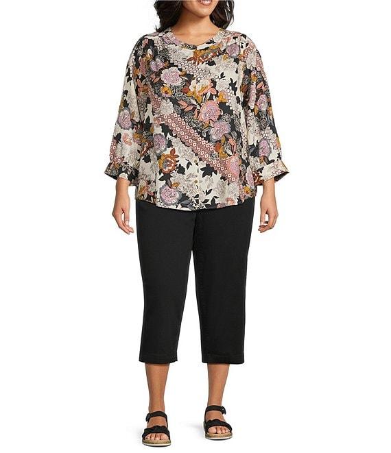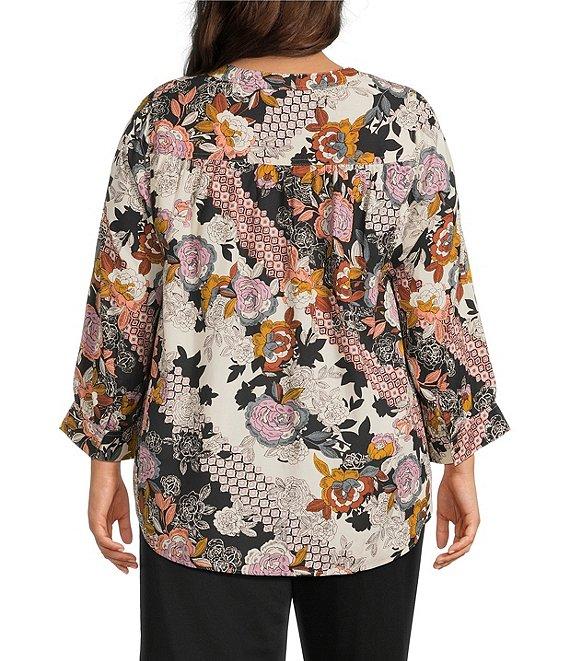 Intro Plus Size Soft Puckered Patch Floral Print Split Round V-Neck 3/4 Sleeve Button Front Shirt