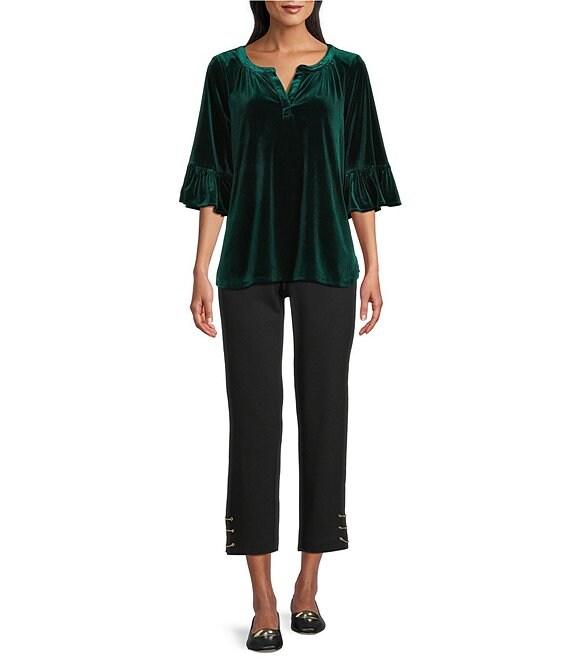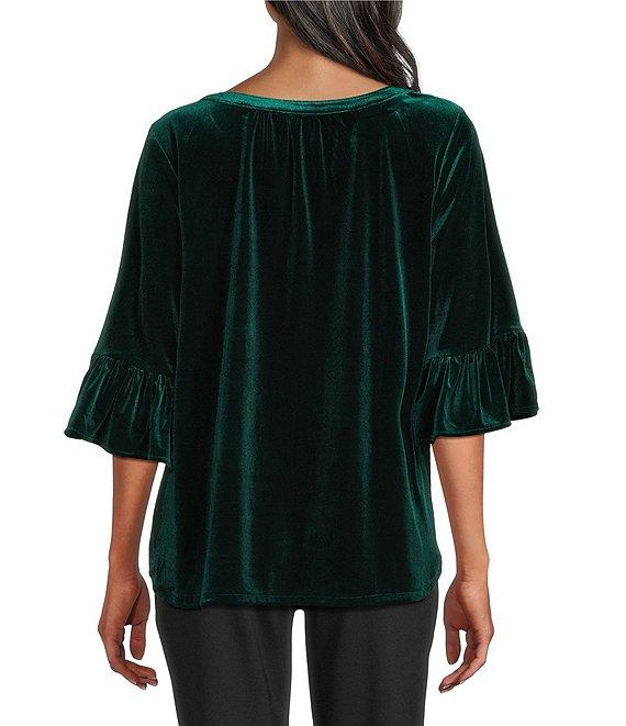 Intro Silky Velvet Split V-Neck 3/4 Flounce Ruffle Sleeve Blouse