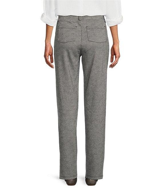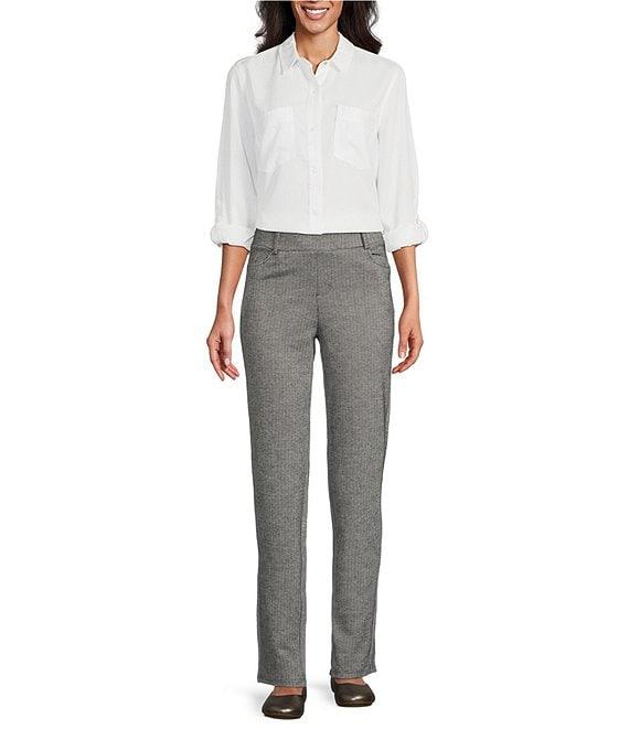 From Intro, these pants feature: Double knit fabrication Flat front silhouette Elasticized waistband Belt loops Faux front pockets Functional back patch pockets Pull-on construction Approx. 30" inseam Rayon/rayon/nylon/spandex Machine wash/tumble dry Imported.