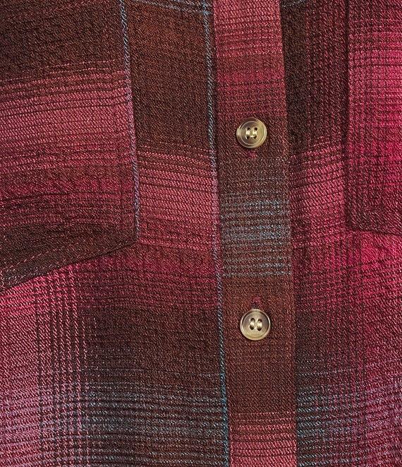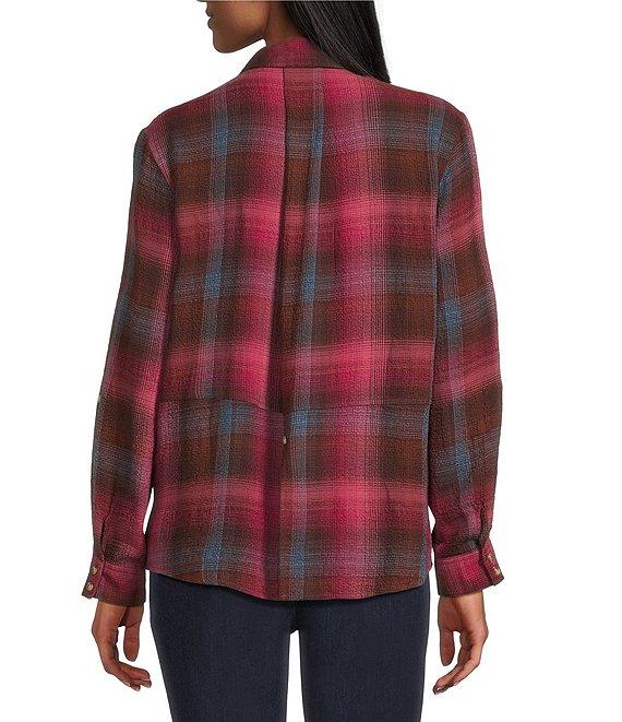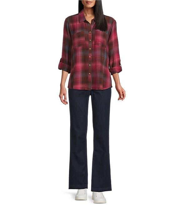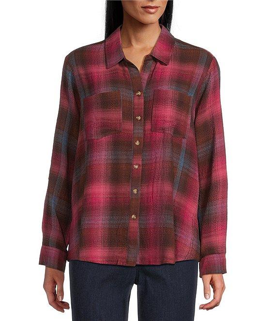 From Intro, this shirt features: Woven pucker plaid fabrication Point collar 3/4 rolled-tab sleeves Two functional patch pockets Split back with button detail Button-front closure Approx. 26.75" length Rayon/polyester/elastane Machine wash/ line dry Imported.