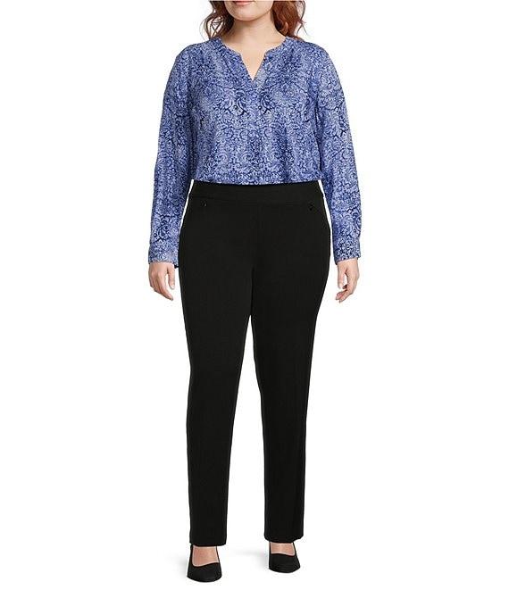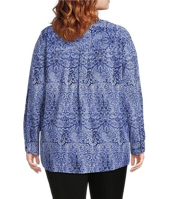 Investments Plus Size Nora Mazarine Scroll Long Sleeve Y-Neck Drapey Twill Blouse