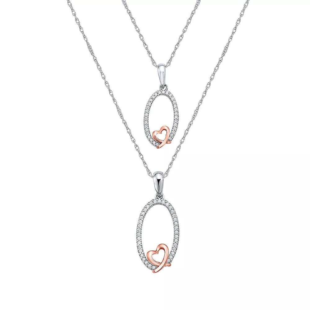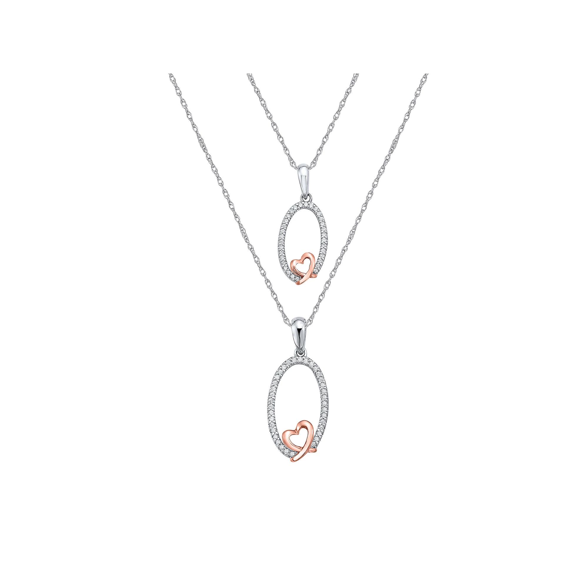 Featuring an open oval pendant decorated with a rose gold-tone heart and sparkling diamond accents, this necklace duo makes a perfect gift for mother and daughter. Featuring an open oval pendant decorated with a rose gold-tone heart and sparkling diamond accents, this necklace duo makes a perfect gift for mother and daughter. Pendant size: 0.82"L x 0.42"W Chain length: 18 in. (Mother) Chain length: 16 in. (Daughter) Chain type: rope Nickel free Metal: sterling silver Plating: rose gold tone Finish: polished Packaging: boxedDIAMOND DETAILS Total weight: 1/4 ct. Color grade: I-J Clarity: I2-I3 Shape: round Setting: prong Diamond weights are approximate. Diamond Total Weights may vary between .01 and .13 ct. Some diamonds consist of fewer than 17 facets. Gemstones may have been treated to enhance their appearance. Special care may be required. Please visit our Gemstone Treatment & Special Care Guide for more information. Image(s) may be enlarged to show detail. Please note, due to the high value of this item, a signature may be required upon delivery. Size: 18". Color: Pink. Gender: female. Age Group: adult. Material: Gold Over Sterling.