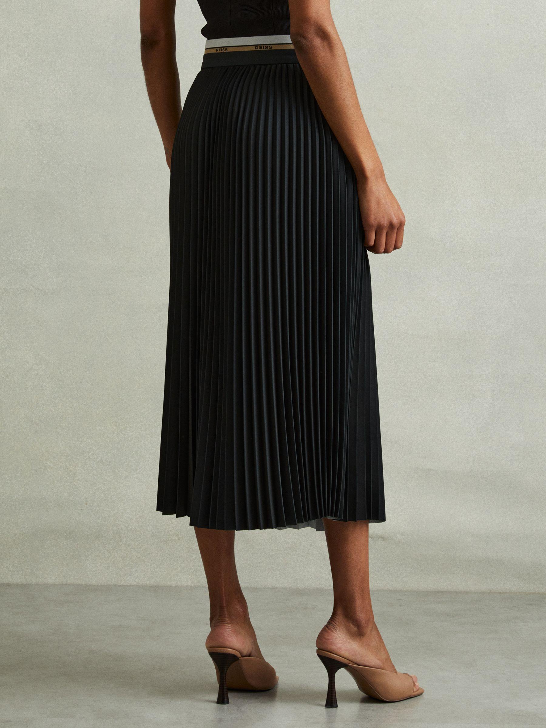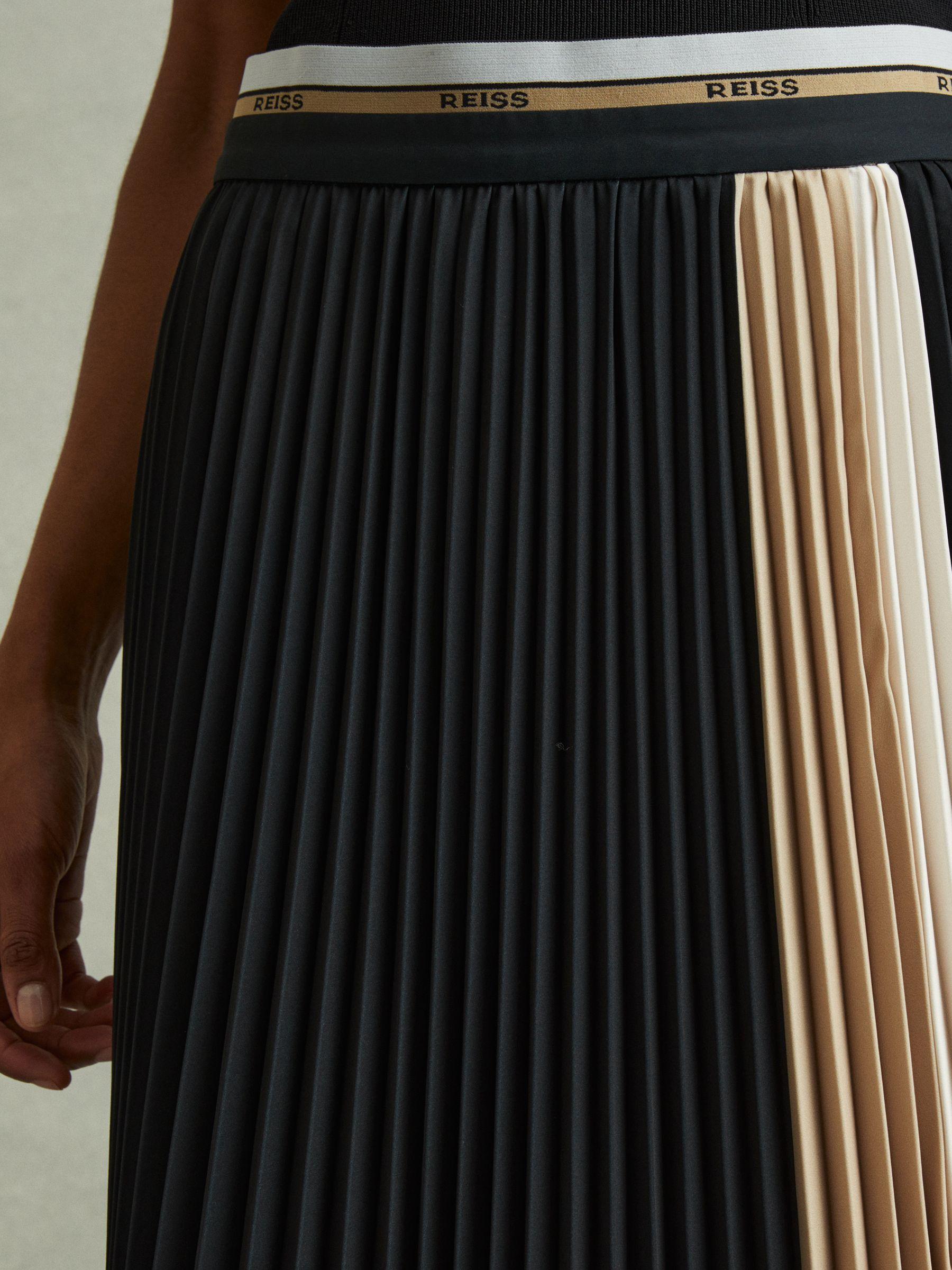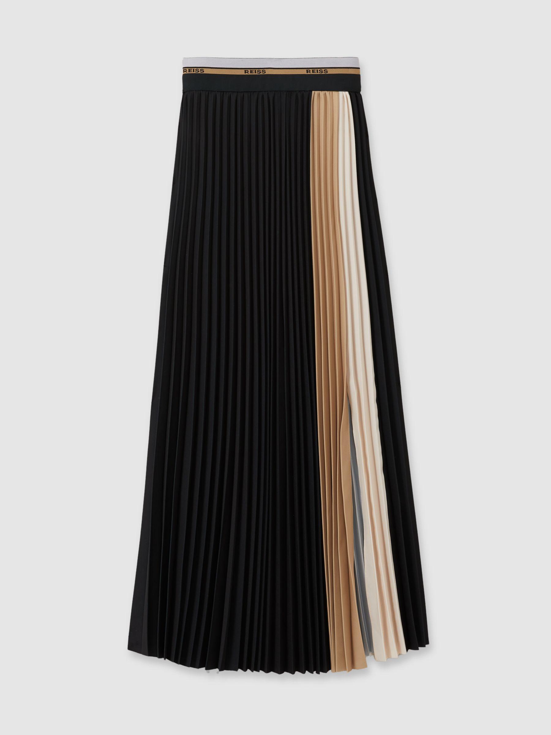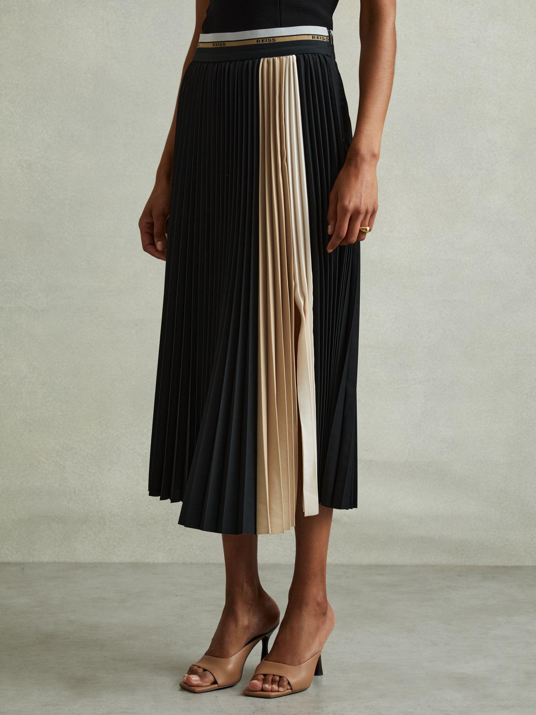 Cut into a midi length with tight knife pleats, the Iris skirt is a classic style for us. It s designed with contrasting panels to the front and an elasticated trim to the waistband. Colourblock design Pleated Waistband detailing Front split Zip-closure to side Midi length The model is wearing a size 8 Measurements of model: Height 5 10" / 177.8cm
