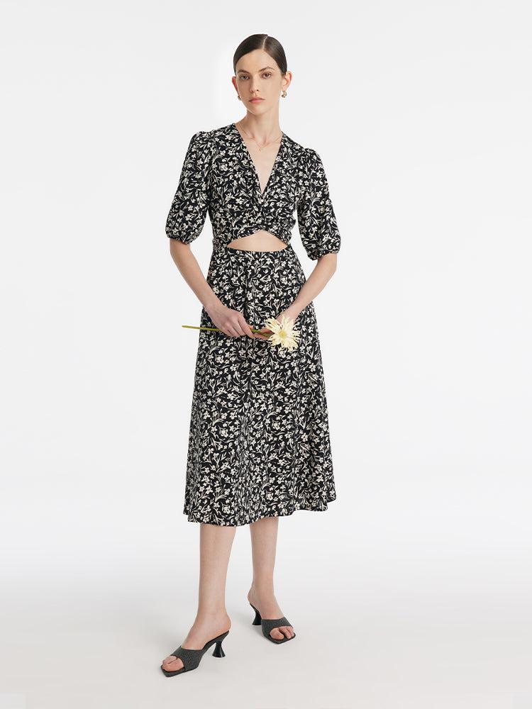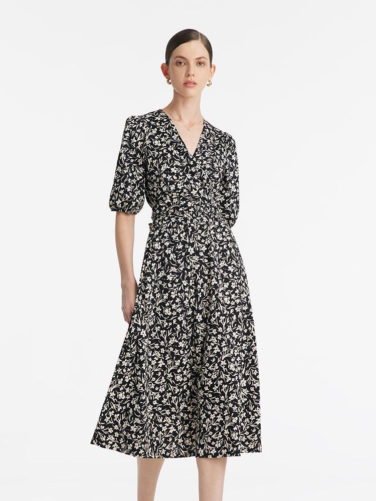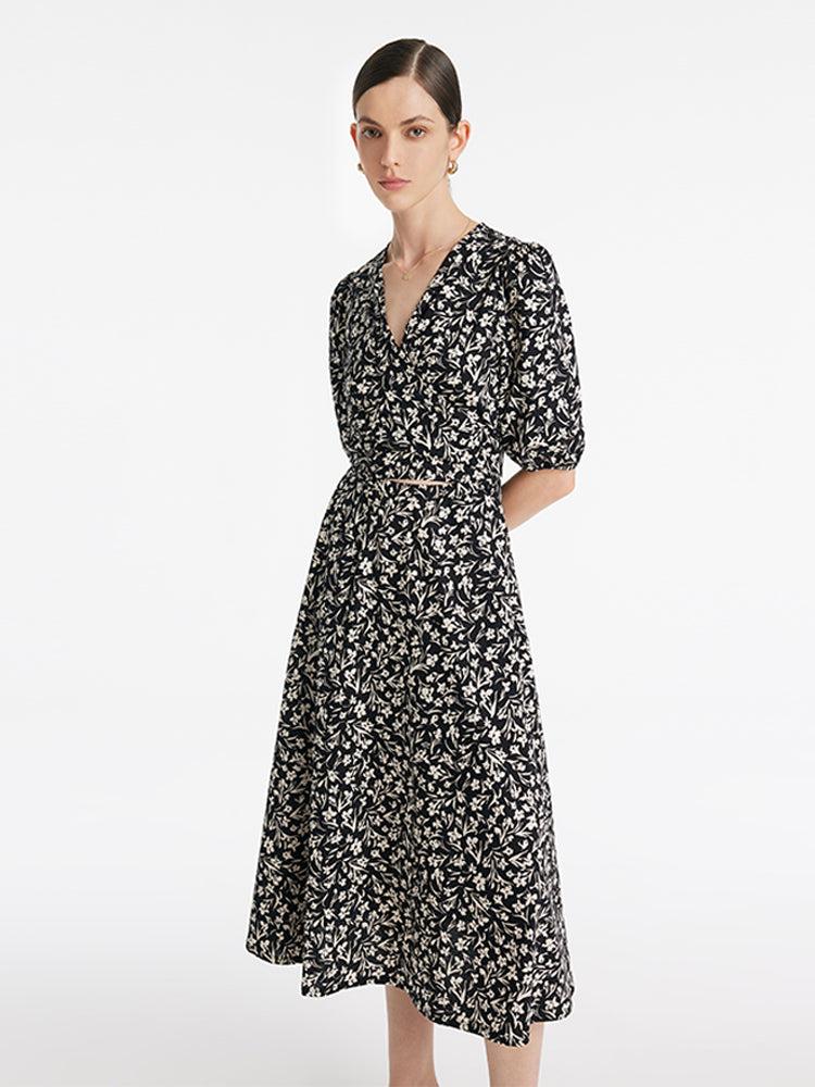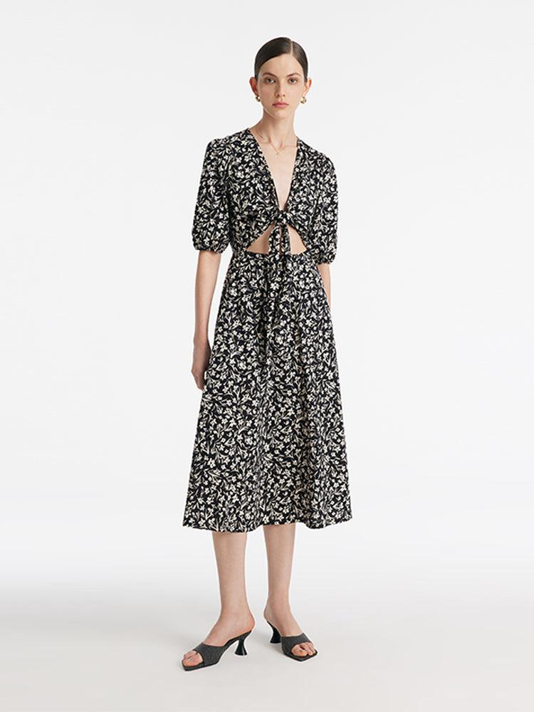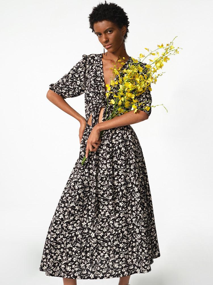 -V-neck -A-line fit -Vacation wear This dress features the national flower of France, the iris, which is full of freedom and vitality. The adjustable ties bring three styling options. You can tie the belt to accentuate the waistline. You can also tie at the back of the waist for a more elegant look, suitable for formal