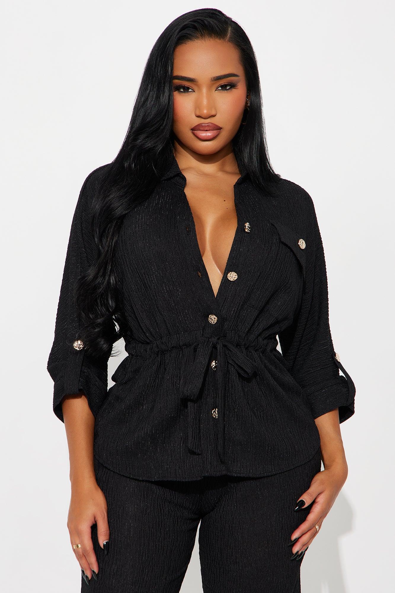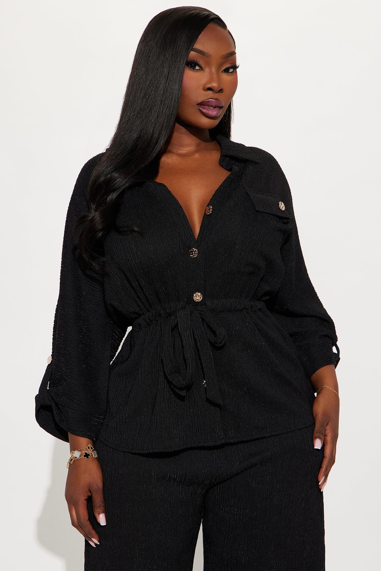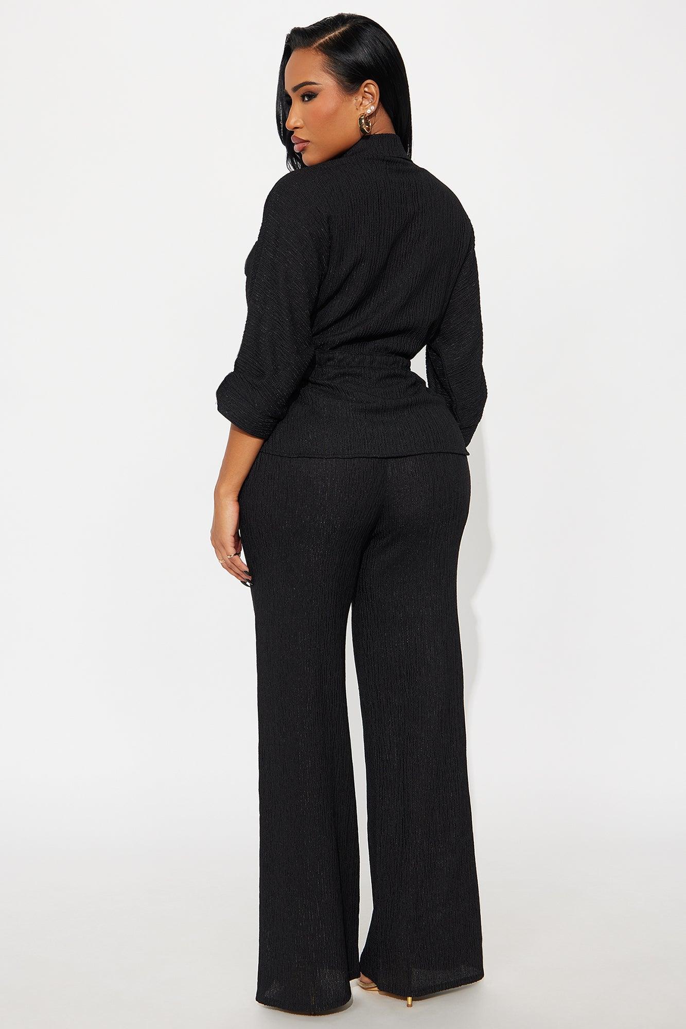 Available In Black And Stone. 2 Piece Ensemble Top And Pant Set Stretch Button Up Front Tie Elastic Waistband Wide Leg 32" Inseam Self: 98% Polyester 2% Spandex Imported California Proposition 65WARNING: Cancer and Reproductive Harm - www.P65Warnings.ca.gov.