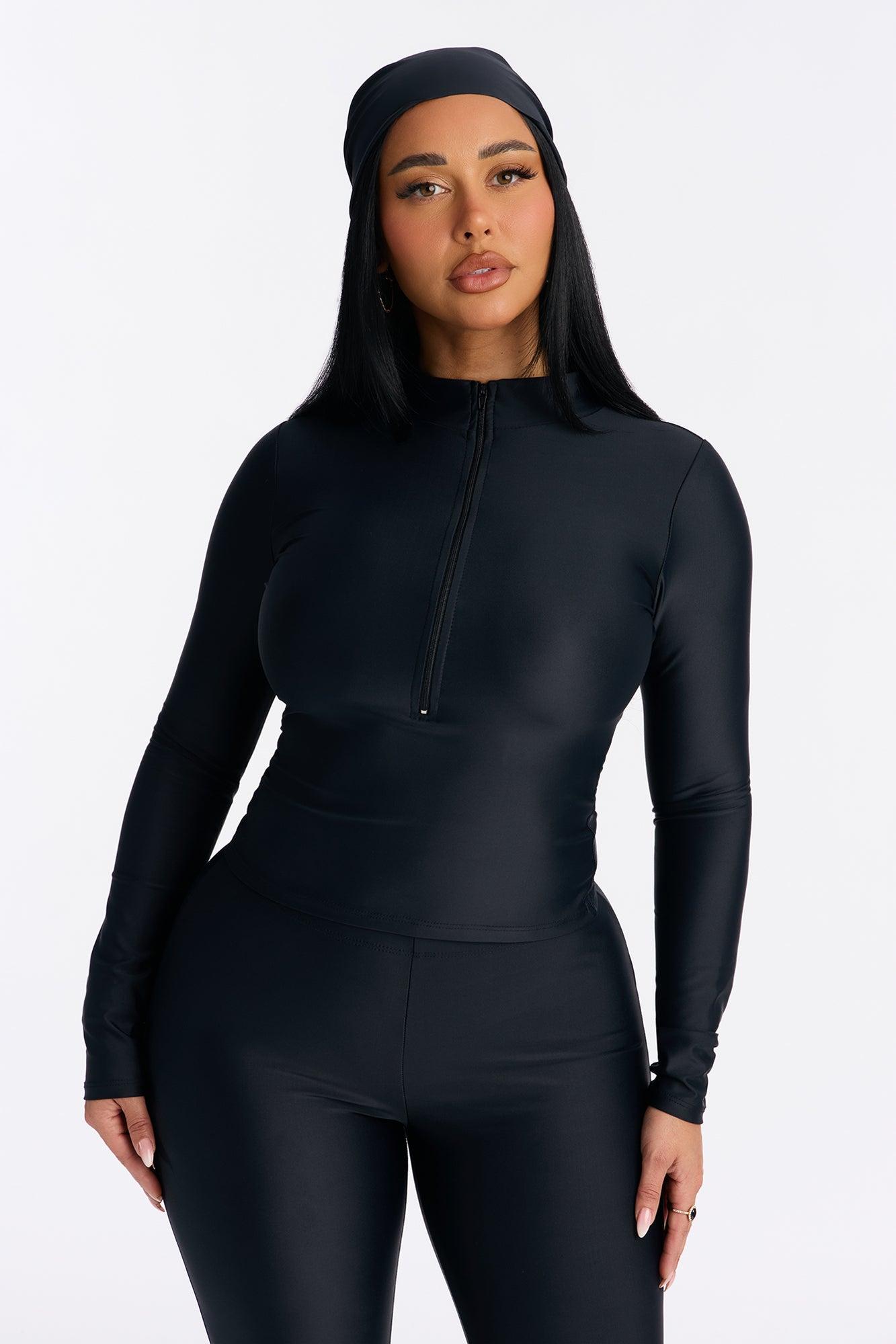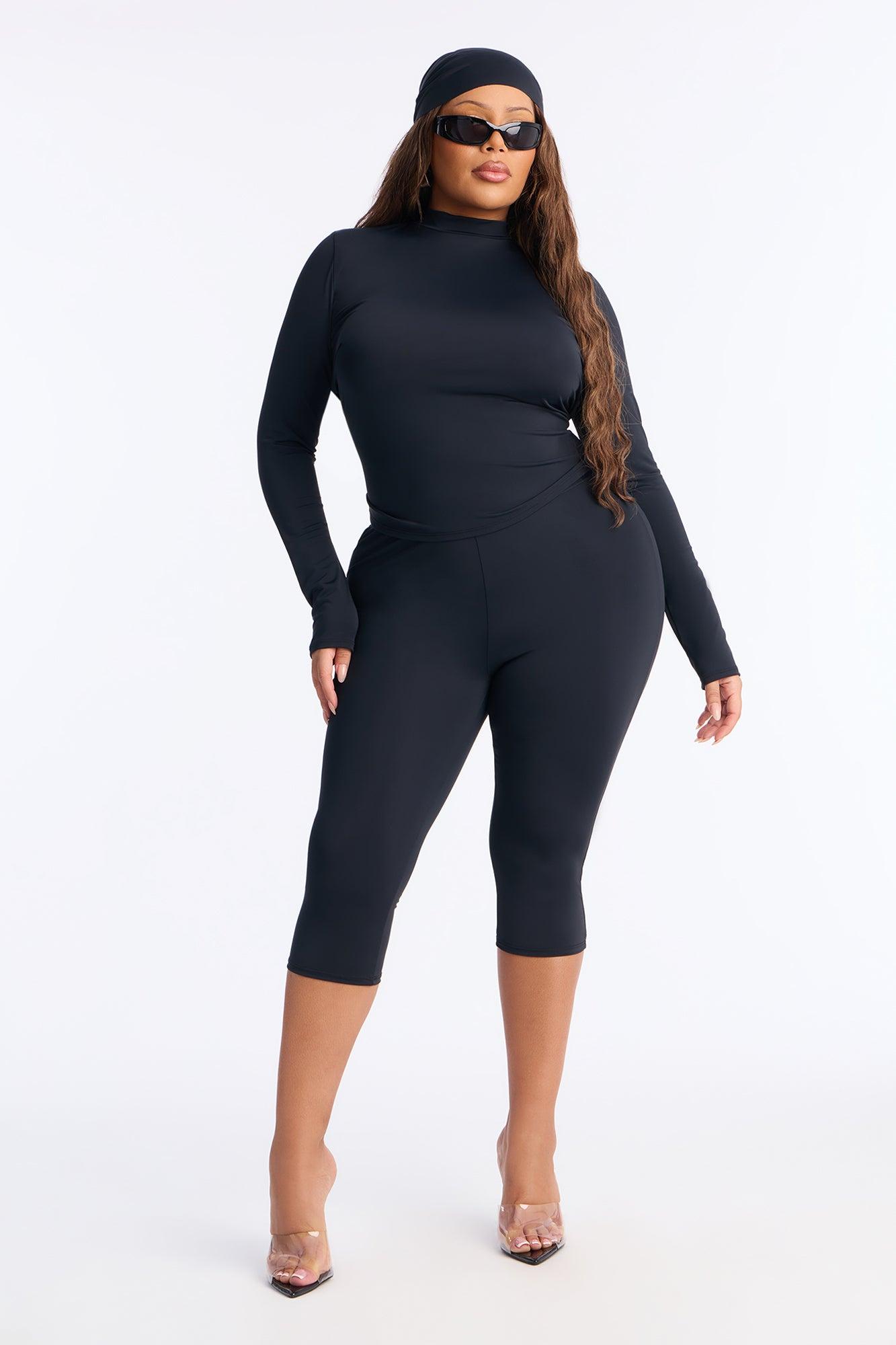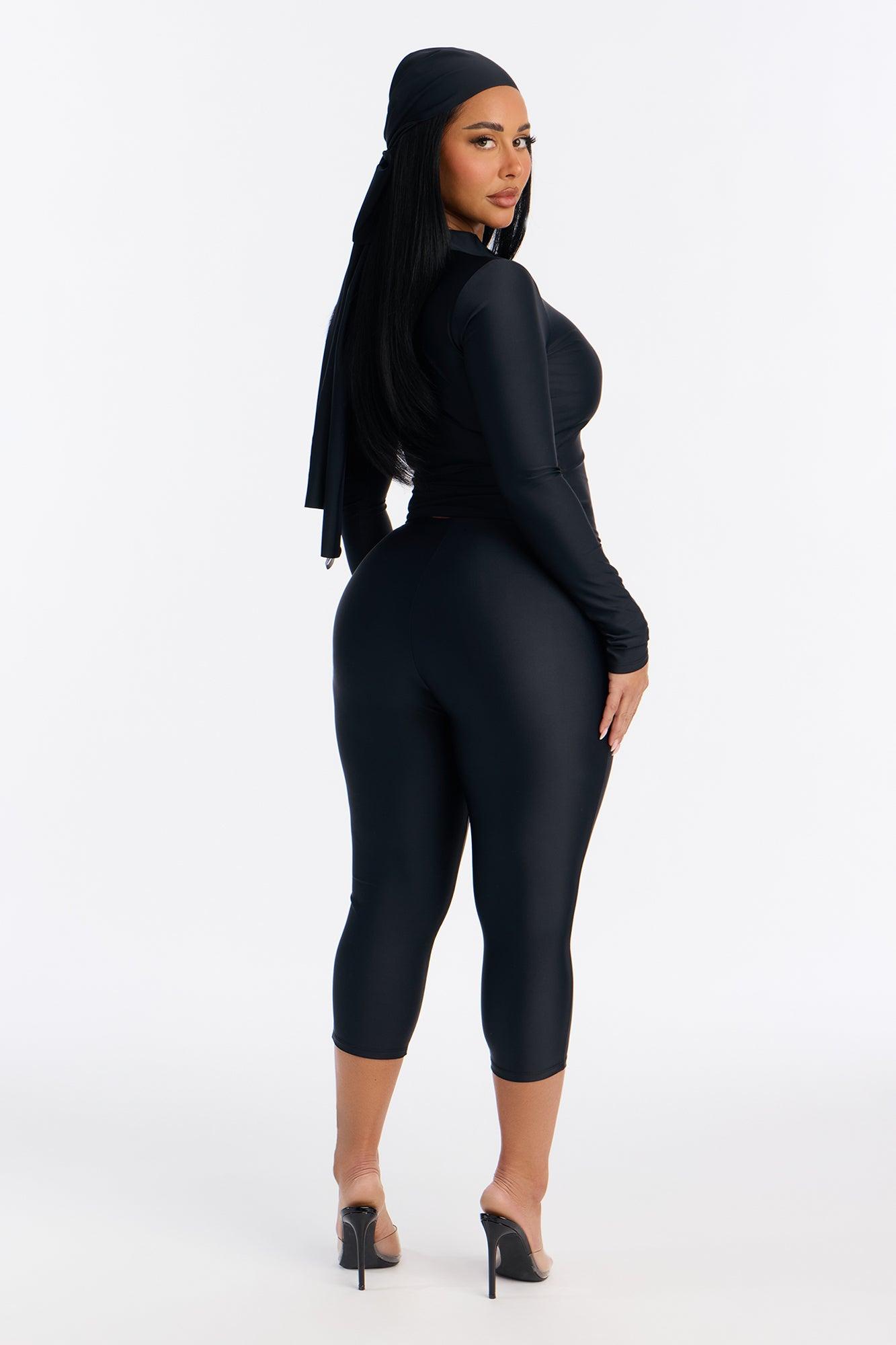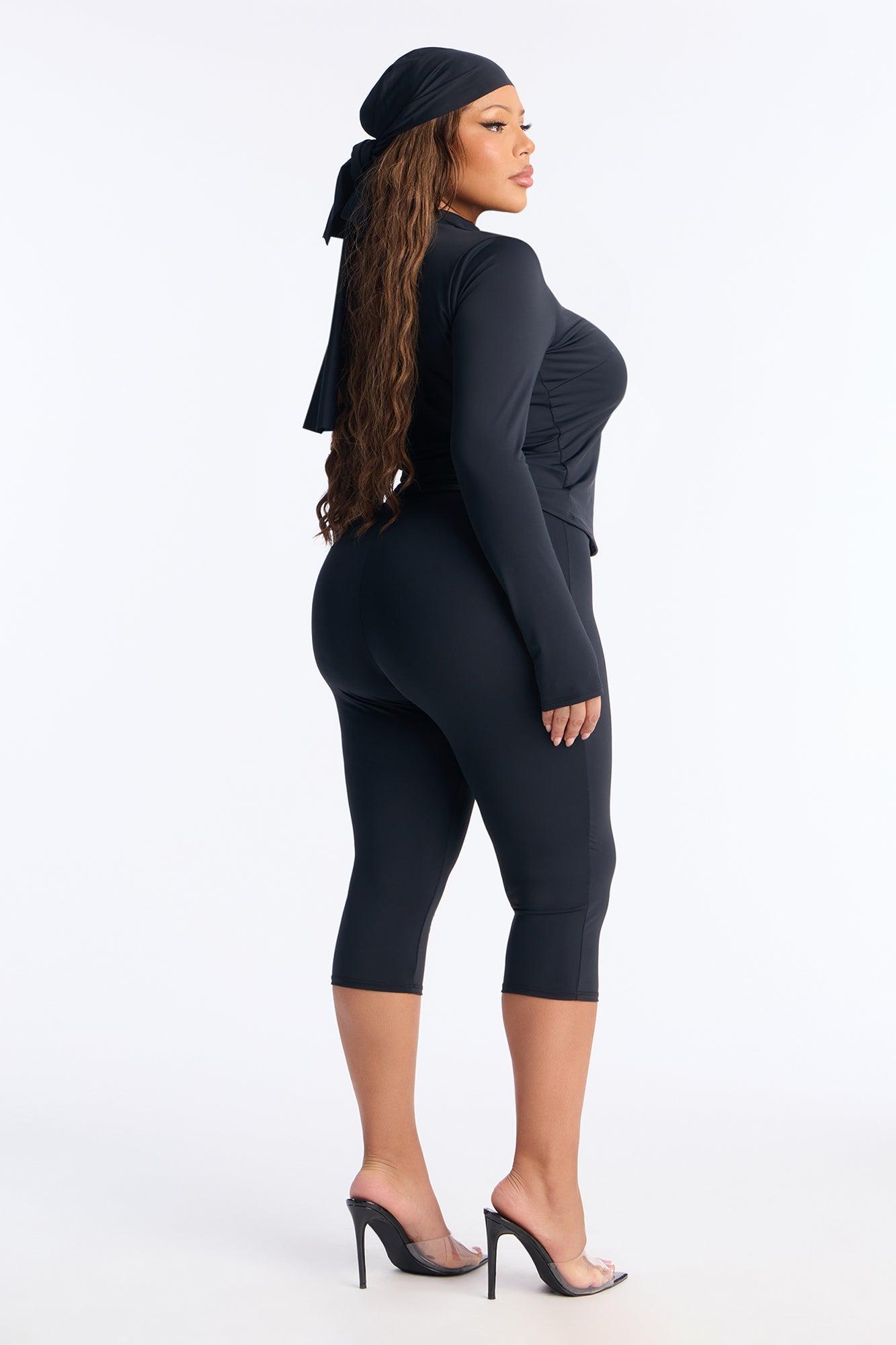 Available In Black, Chocolate And Red. 3 Piece Ensemble Scarf, Long Sleeve, And Capri Pant Stretch 20" Capri Elastic Waistband Self: 82% Polyester 18% Spandex Imported California Proposition 65WARNING: Cancer and Reproductive Harm - www.P65Warnings.ca.gov.