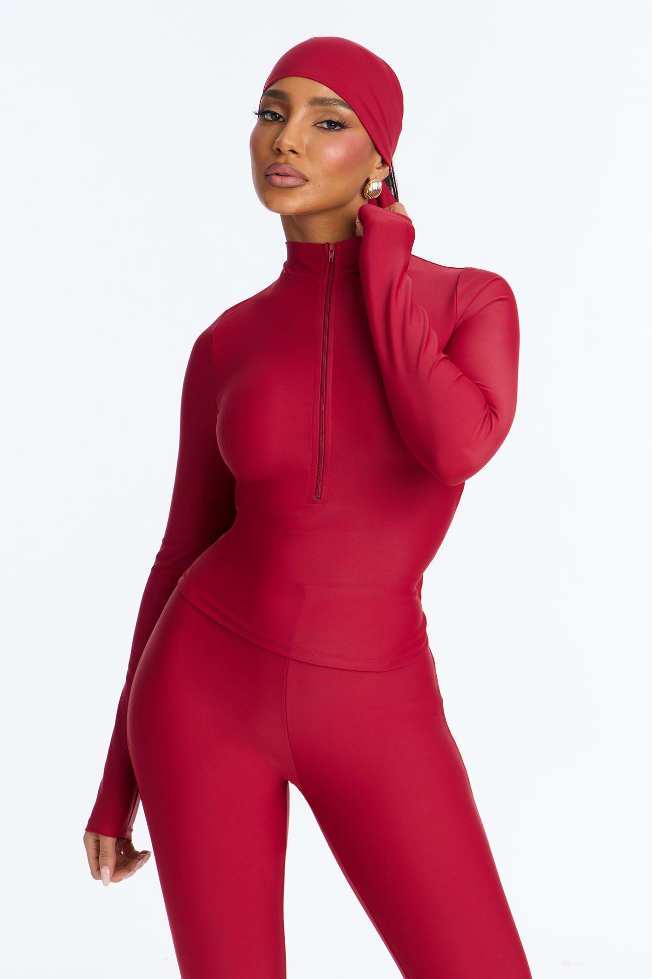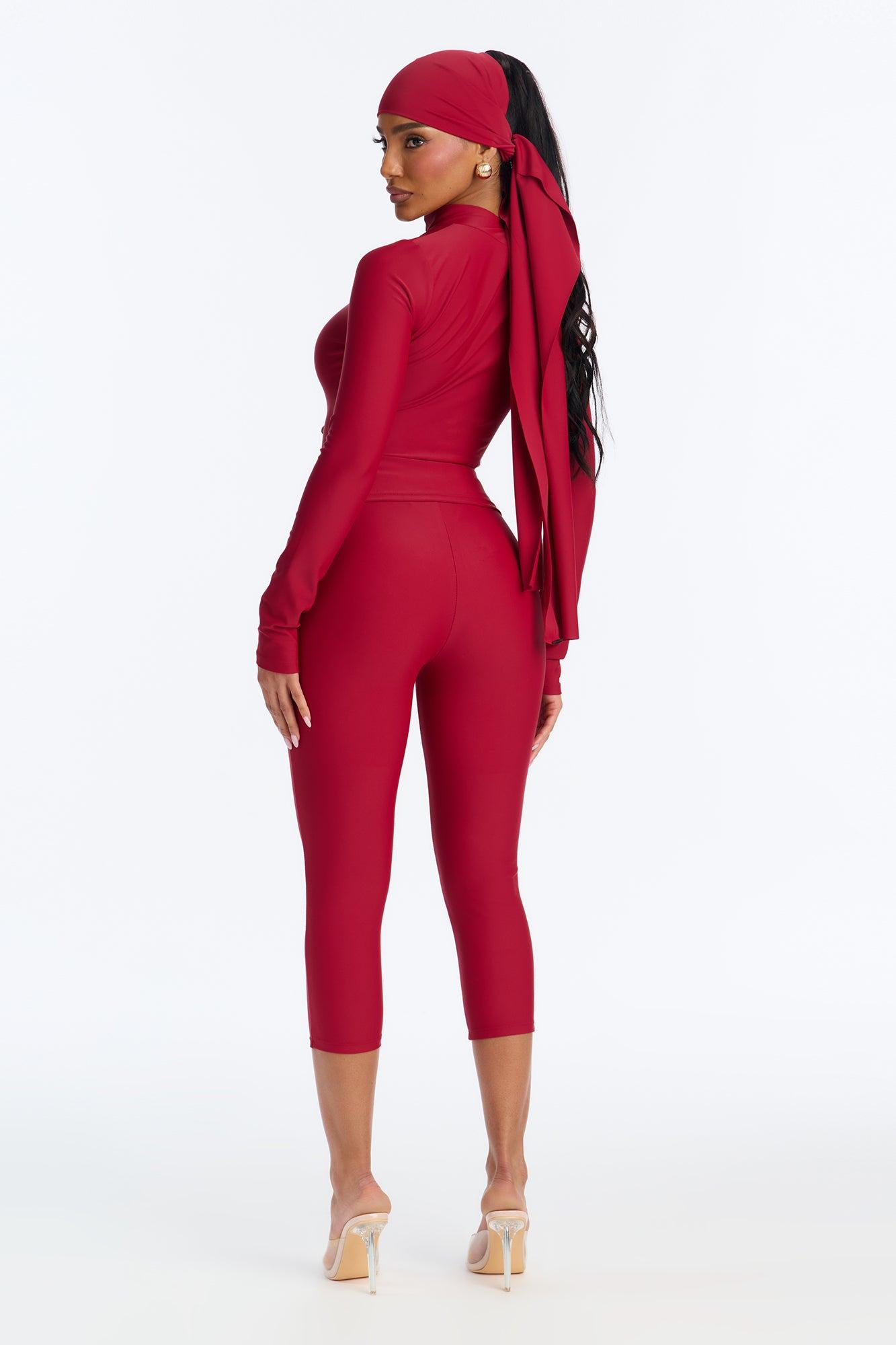 Available In Black, Chocolate And Red. 3 Piece Ensemble Scarf, Long Sleeve, And Capri Pant Stretch 20" Capri Elastic Waistband Self: 82% Polyester 18% Spandex Imported California Proposition 65WARNING: Cancer and Reproductive Harm - www.P65Warnings.ca.gov.