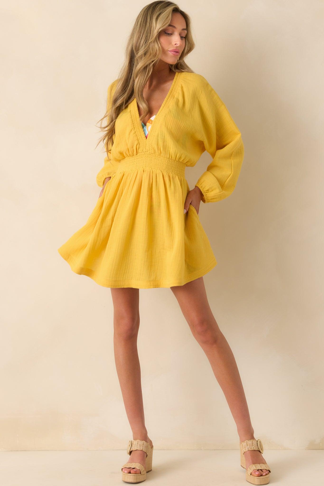 It Always Works Out Yellow Cotton Gauze Mini Dress is a sunny reminder to trust the flow. Light, uplifting, and full of optimism—it’s the kind of piece that brings good energy wherever it goes. This yellow mini dress features a lightweight cotton sheer gauze fabric, smocked v-neckline, back keyhole button closure, long dolman sleeves, elastic cuffs, smocked waistband, and functional pockets.