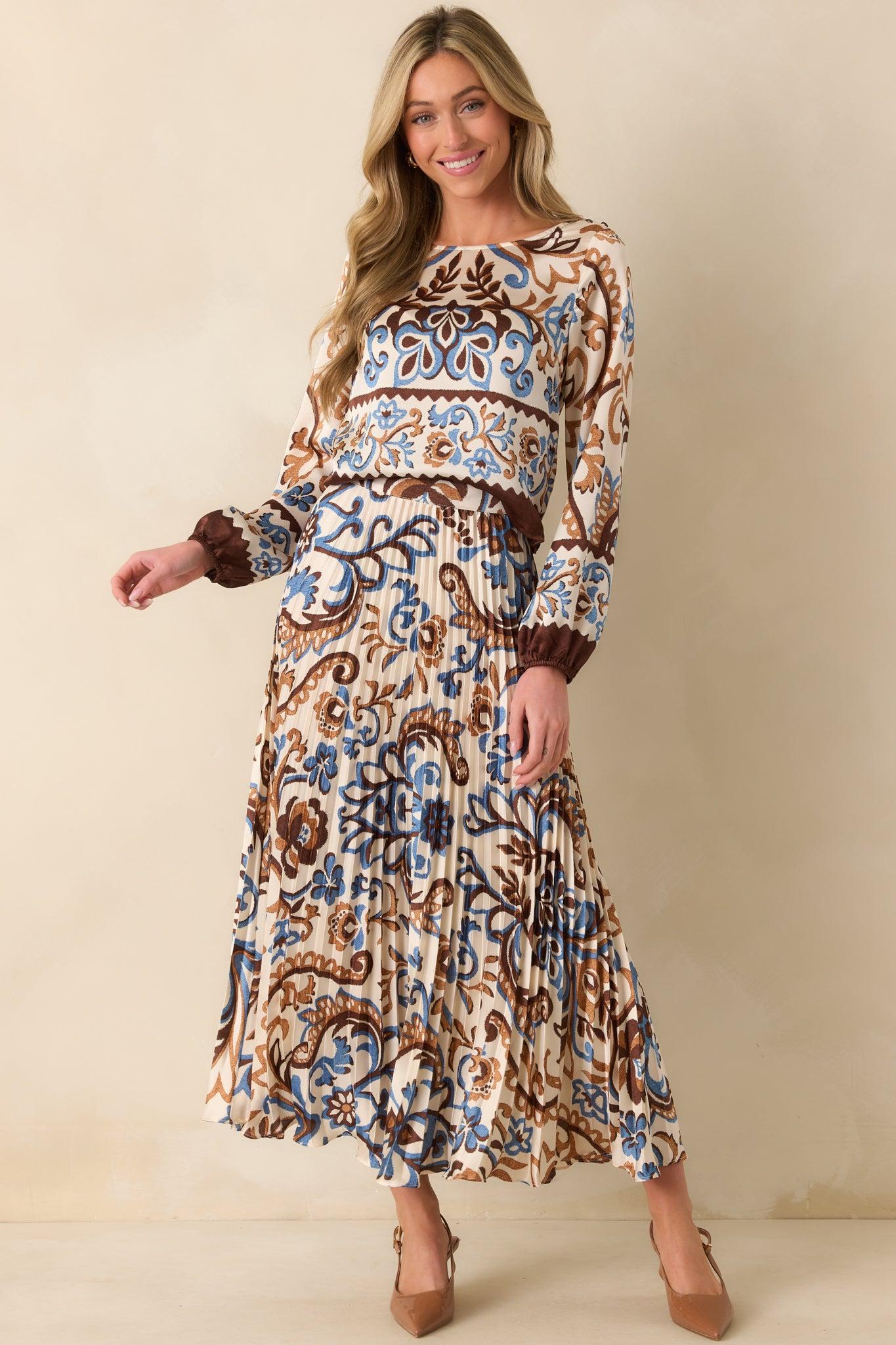 The It’ll All Make Sense Ivory Multi Print Satin Long Sleeve Top is one of those pieces that pulls everything together. It’s easy to dress up, effortless to wear, and made for the days when you want to keep things interesting. This ivory top features a blue and brown paisley floral print, a round neckline, functional three button detail on both shoulders, a cropped length, long puff sleeves, elastic cuffs, and a shiny satin finish. 100% Polyester Unlined Hand Wash Cold Manufactured in China Designed in The USA Model is 5'8" and is Wearing a X-Size Small