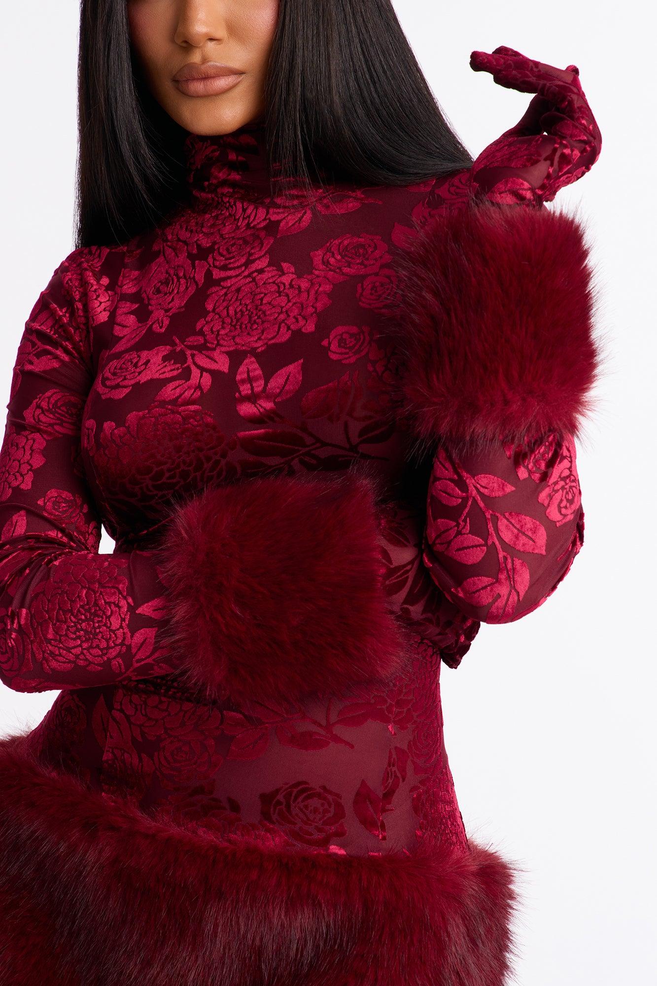 Available In Burgundy. Mesh Flocked Mini Dress High Neck Long Sleeve Fur Trim Gloves Length Measured Flat = 32" Disclaimer: Burnout Placement May Vary. Self: 70% Polyester 20% Nylon 10% Spandex Contrast/Lining: 100% Polyester Imported California Proposition 65WARNING: Cancer and Reproductive Harm - www.P65Warnings.ca.gov.