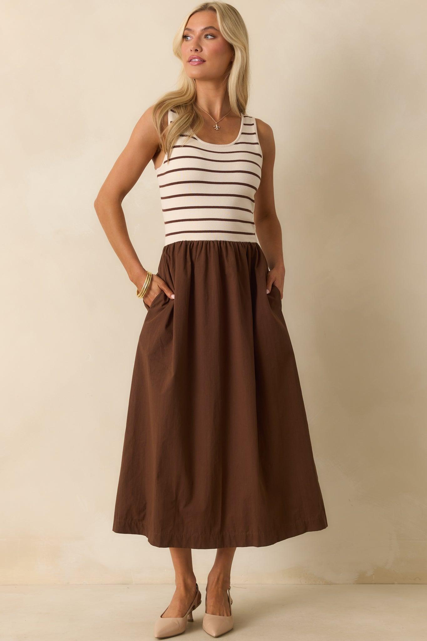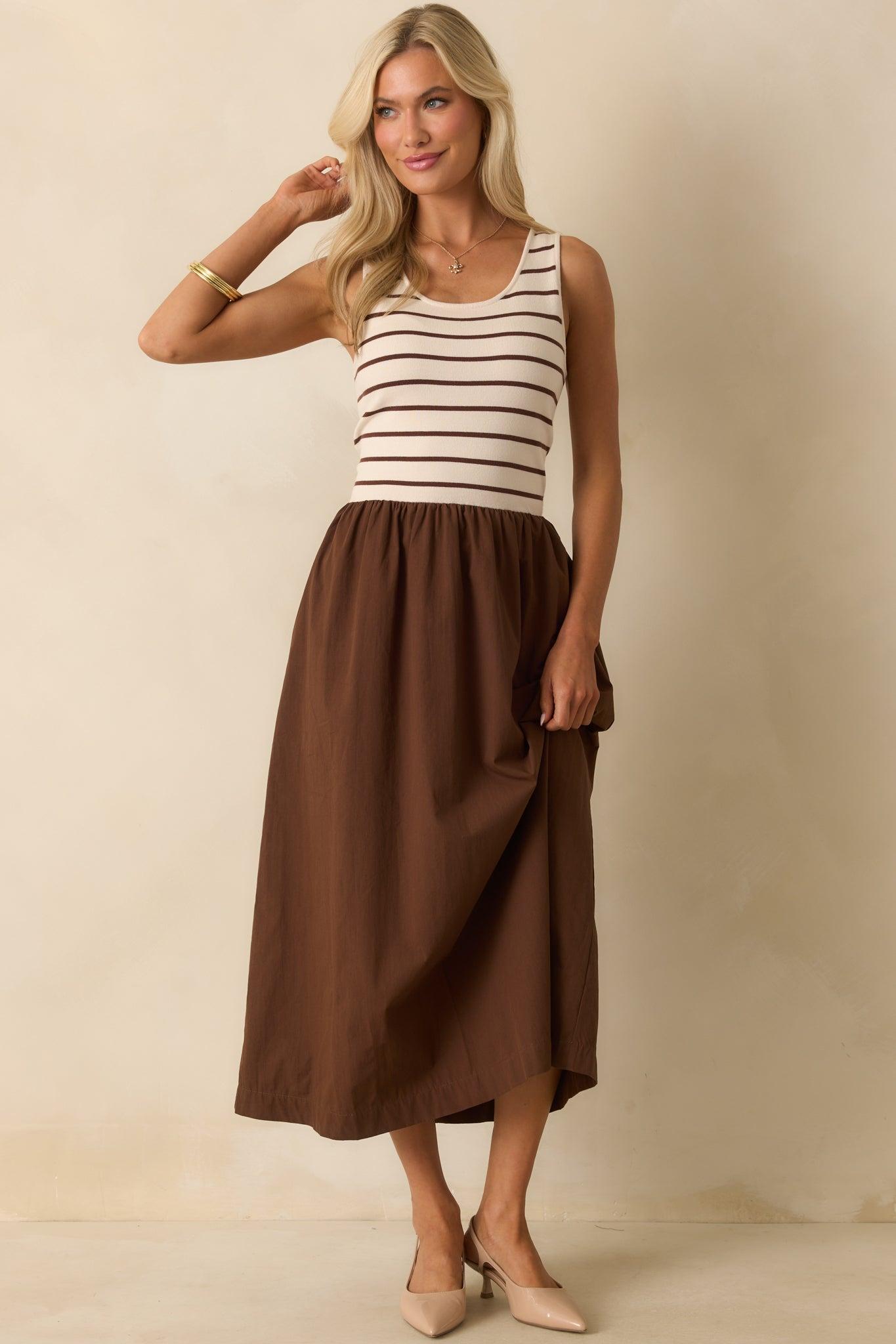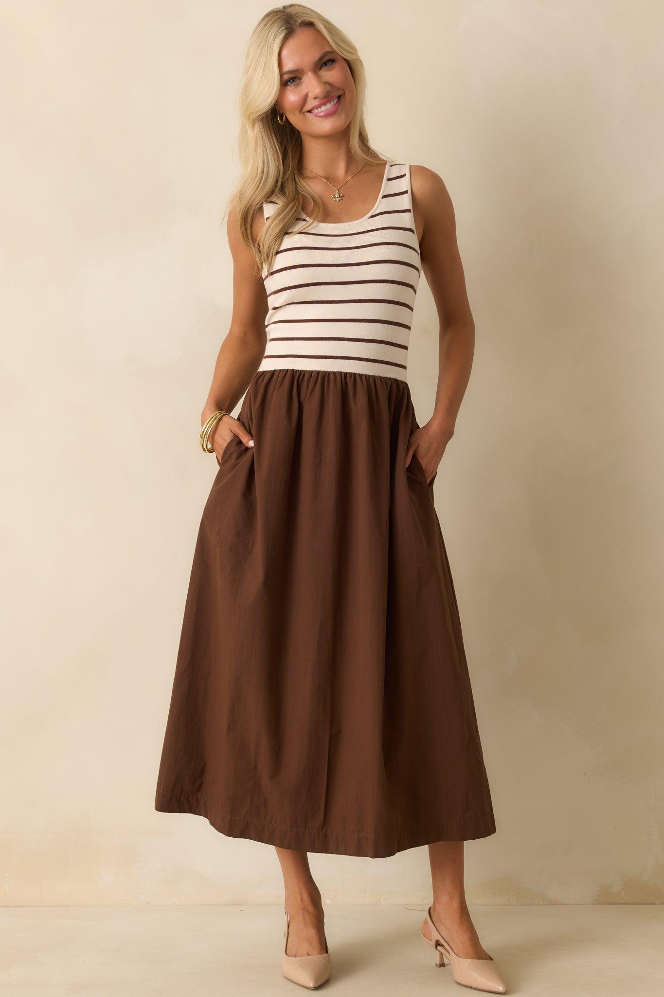 The It’s In The Books Brown Stripe Knit Bodice Maxi Dress is all about sealing the deal in style, giving you that fun, confident vibe that makes every plan feel like it’s already a success story. This maxi dress features an ivory knit bodice with brown horizontal stripes, a scoop neckline, wide tank straps, a gathered waist seam, a solid brown skirt, and functional side seam pockets. 52% Rayon, 29% Polyester, & 19% Nylon Contrast: 100% Cotton Unlined Hand Wash Cold Manufactured in China Designed in The USA Model is 5'6" and is Wearing a Size Small