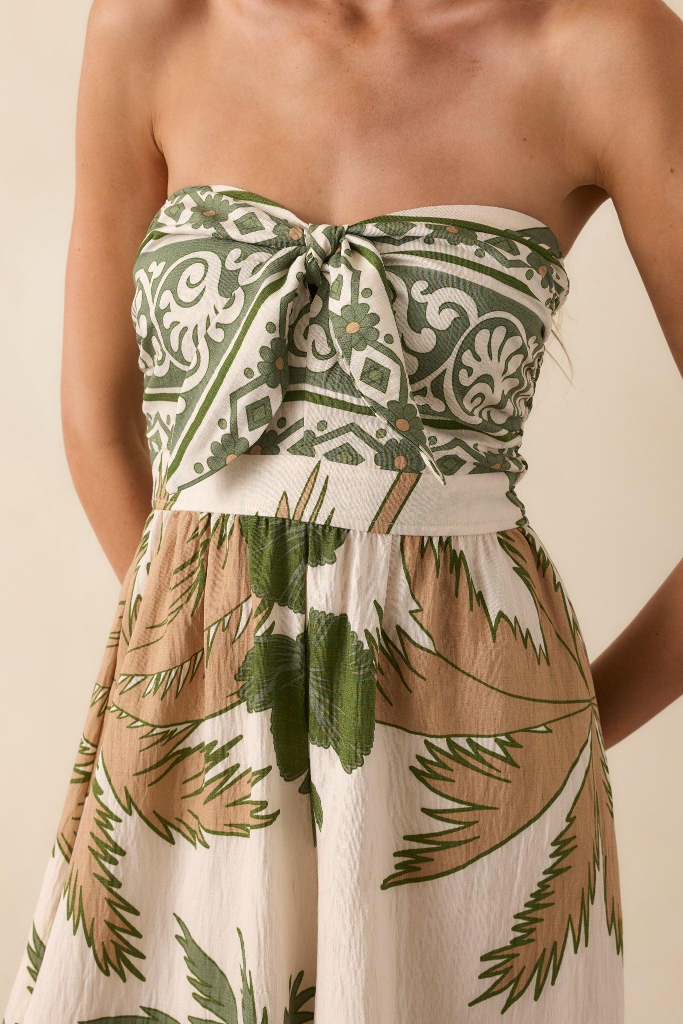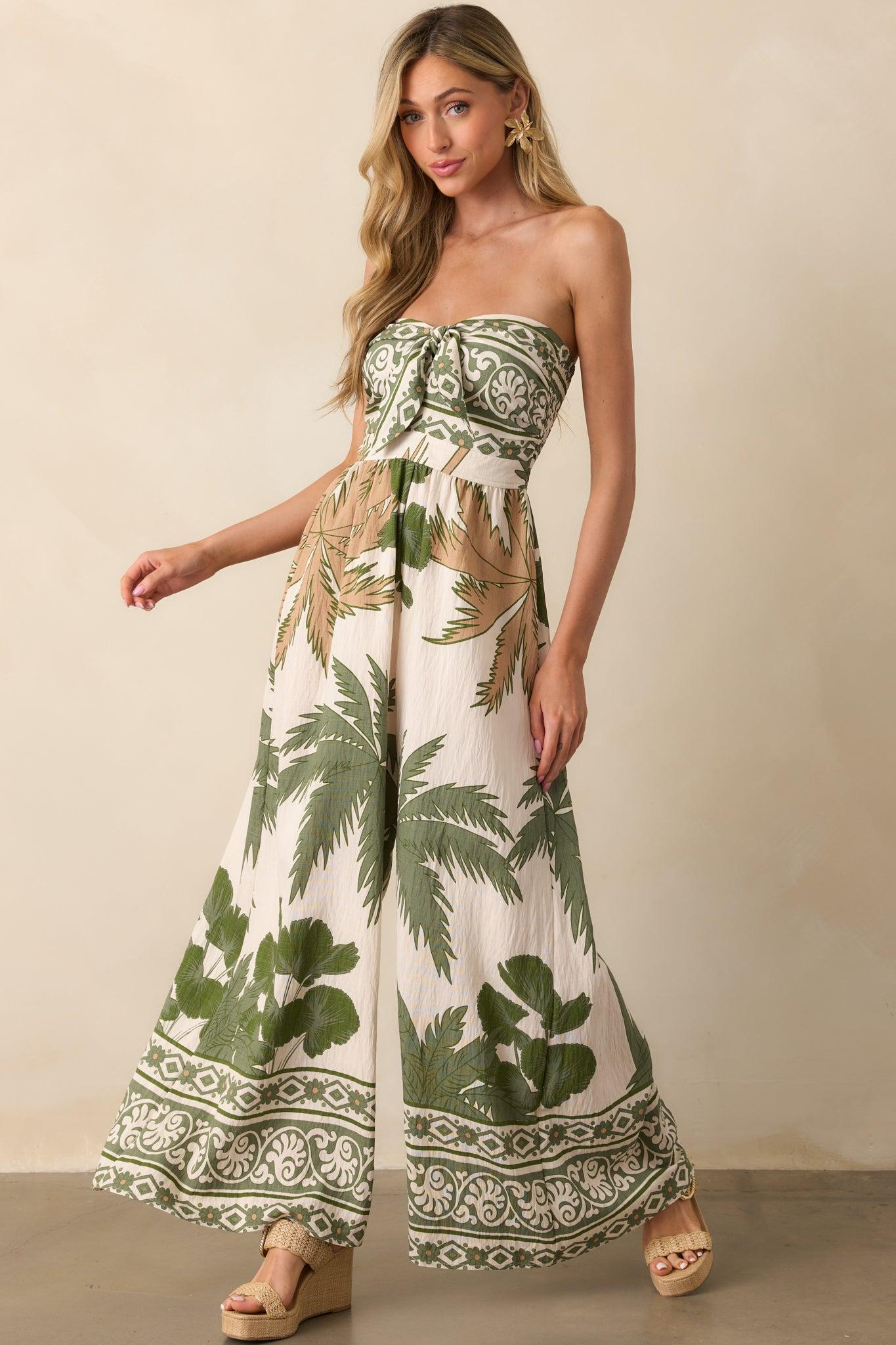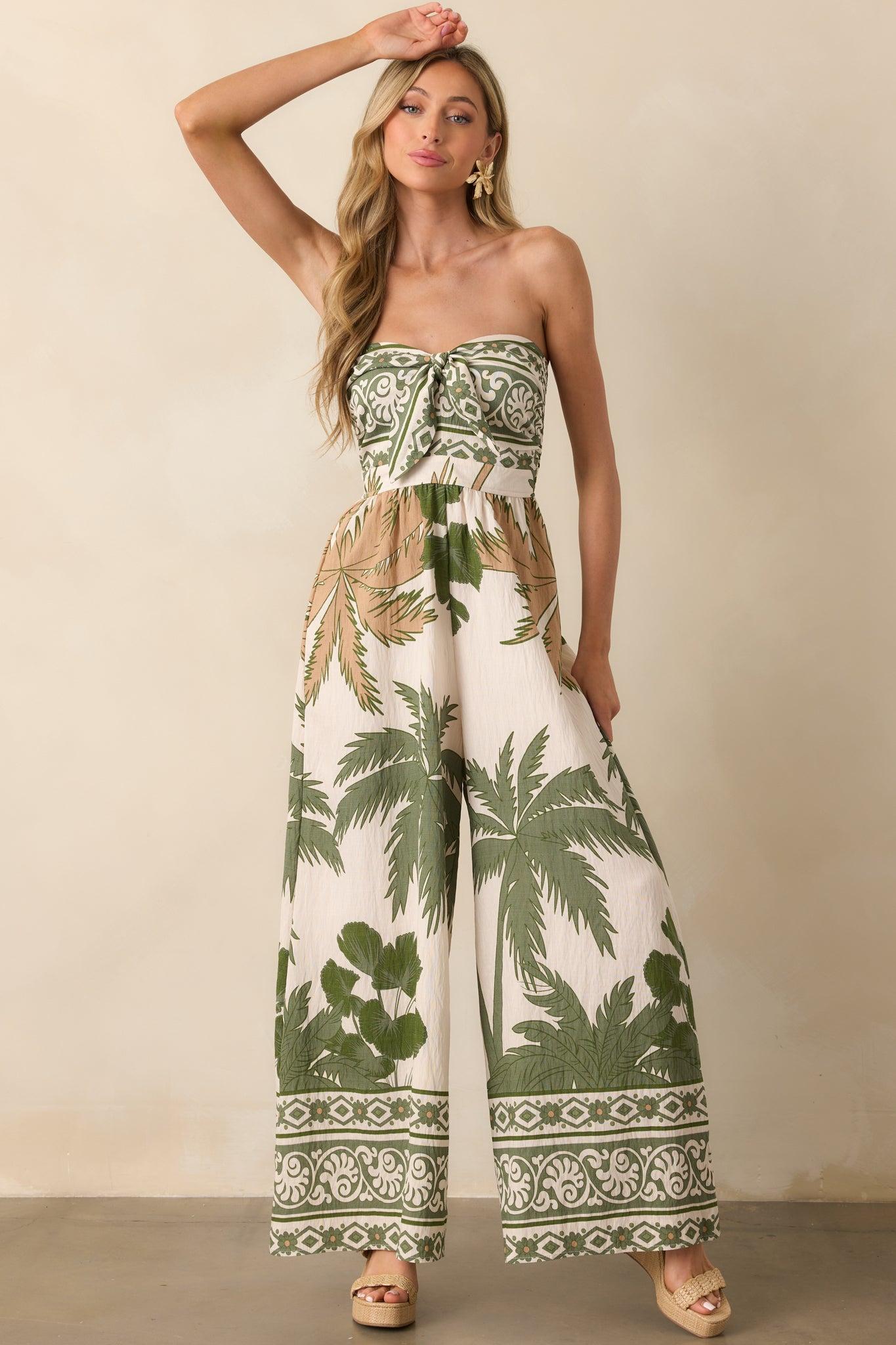 Our It’s Like I Never Left Green Multi Tropical Print Strapless Jumpsuit is made for returning to your favorite getaway spot and slipping right back into vacation mode. Bright and carefree, it’s perfect for seaside dinners, exploring familiar streets, or simply soaking up the vibe of a place you love. This jumpsuit features a green and tan tropical print throughout, a strapless neckline, self-tie front knot detail, back smocked panel, and a wide leg design.