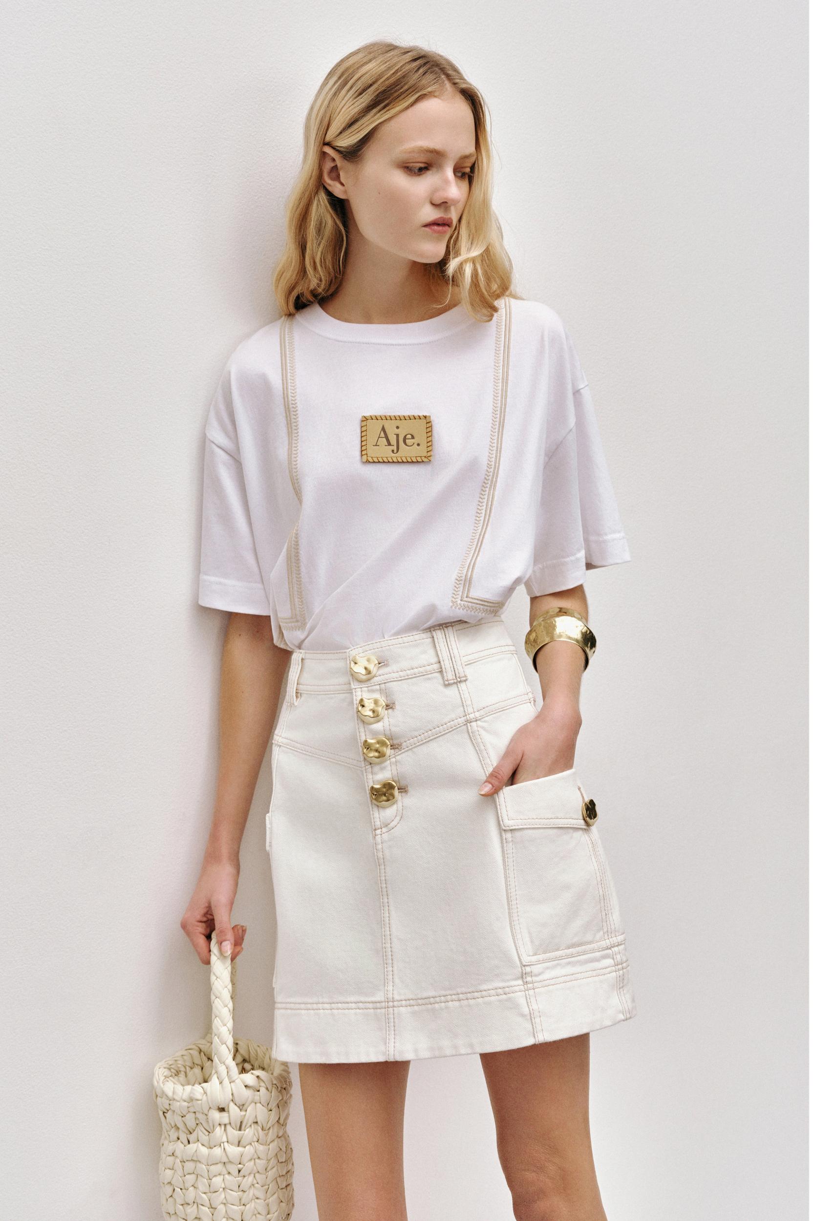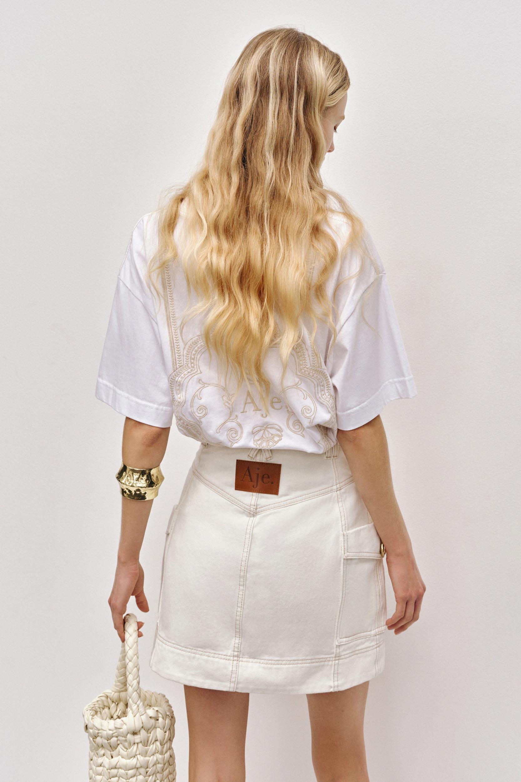 PRODUCT DETAILS Women's denim mini skirt Twin needle stitching Front fly with feature button closure Twin belt loops Gold hardware Patch pockets Coin pocket Cross-back and twin belt loops Leather logo patch at back 100% Cotton Delicate Cold Machine Wash Shop All Skirts SIZE AND FIT Model wears a size 8/S Model: 175cm/ 5'9 Bust: 80cm Waist: 61cm Hips: 86cm