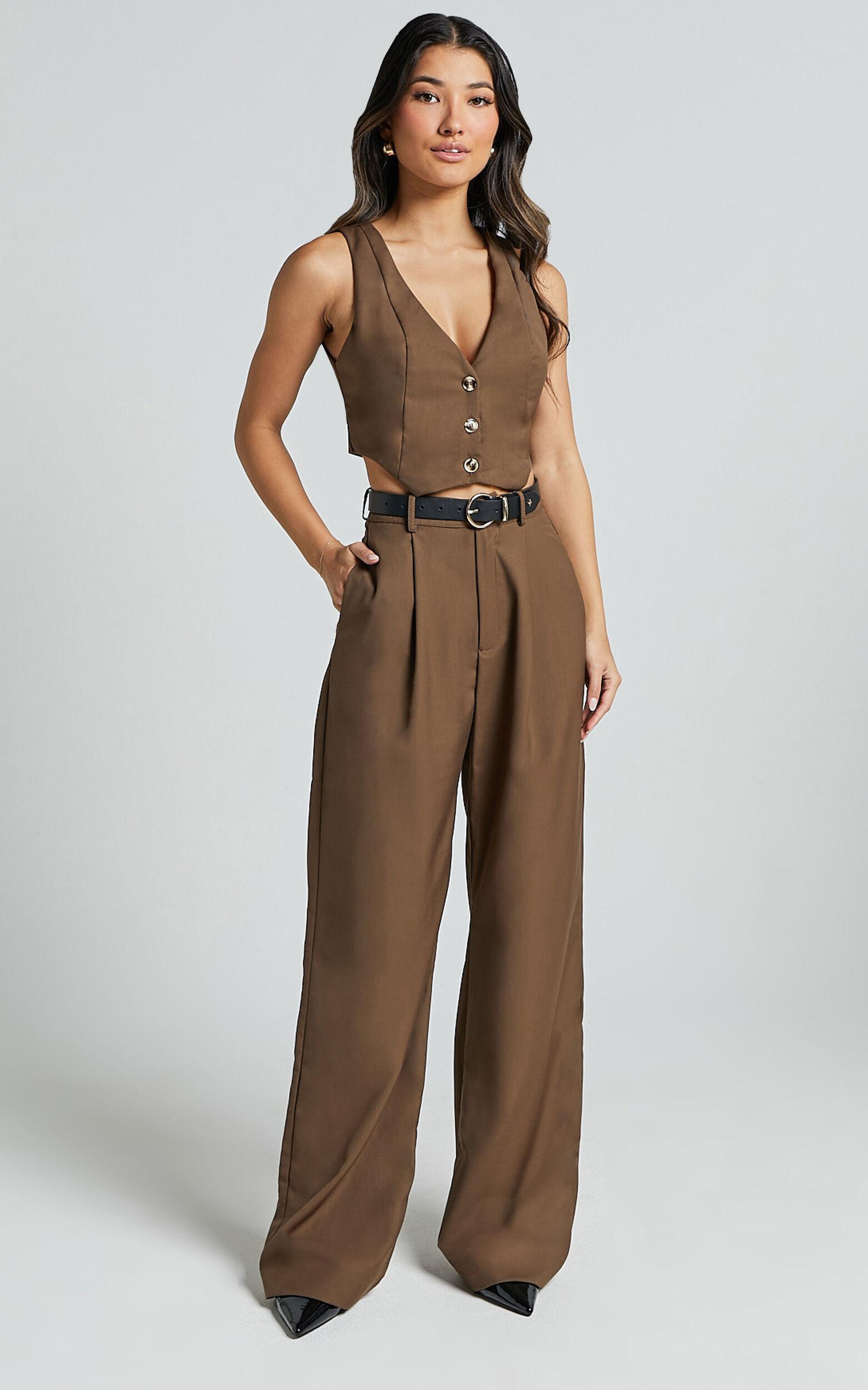 Upgrade your summer wardrobe with the Izara Vest in Oak. This trendy V-neck button-up vest is perfect for both casual outings and workwear ensembles. Crafted from a mid-weight woven polyester, this sleeveless crop top is designed to keep you cool and comfortable all day long. Its flattering cut and versatile brown color make it a must-have piece for any fashionista's closet. Pair it with high-waisted jeans or a skirt for an effortlessly chic look that will turn heads wherever you go. Stay on-trend this season with Showpo's Izara Vest - the ultimate summer essential!Product Details:Mid Weight Woven fabricV Neck necklineCrop lengthSleeveless styleSuitable for Casual and Workwear occasionsMade from Polyester materialPerfect for Summer season.Size and FitSize S / 8 length: 45.5cm / 17.91inMaterial and CareMain Fabric: 95% Polyester, 5% SpandexLow / No stretch