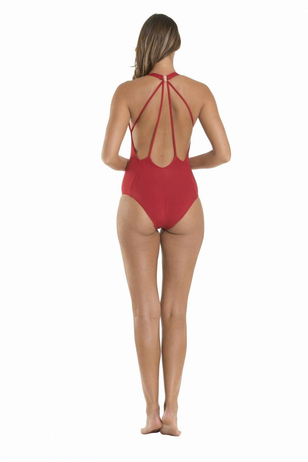 Start the summer with a plunge and shop this elegant V-neck one-piece swimsuit. Complete with a unique multi-strap key hole back you’ll be feeling every bit the bombshell. Features: - Deep plunge neckline - Removable cups - Shelf bra for added support - Fixed front tab detail - Low open back - Multi-strap back detail - Back neck clip - Best suited for an A-C cup size - Australian size 10- Chilli colour