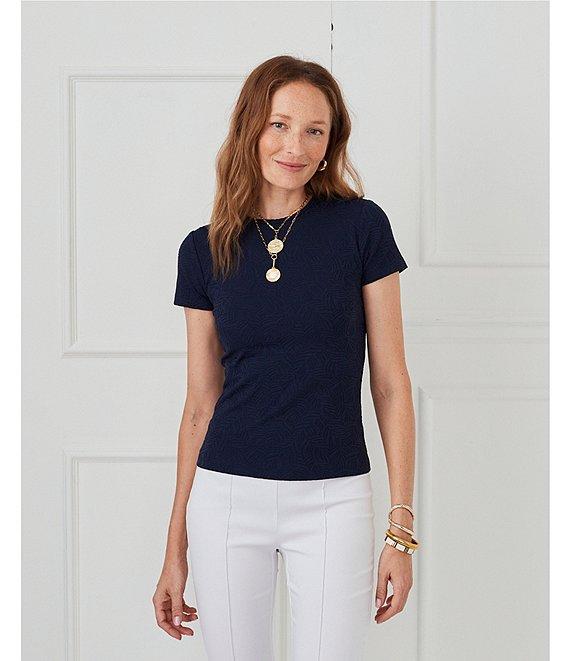 From J.McLaughlin, this tee features: Cotton blend knit fabrication Crew neckline Short sleeves Straight hem Pullover construction Approx. 23.5" length Cotton/modal/spandex Machine wash Imported.