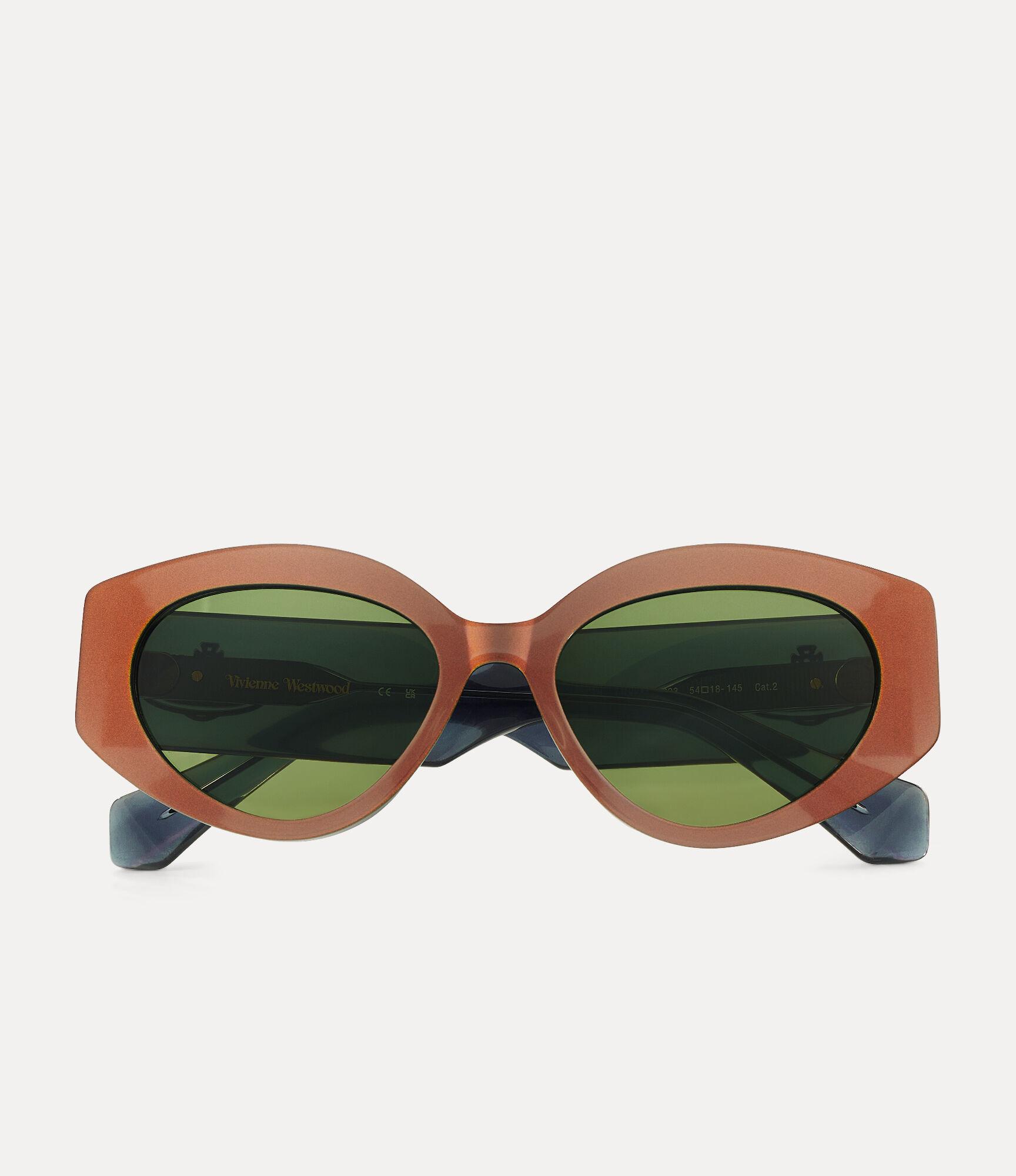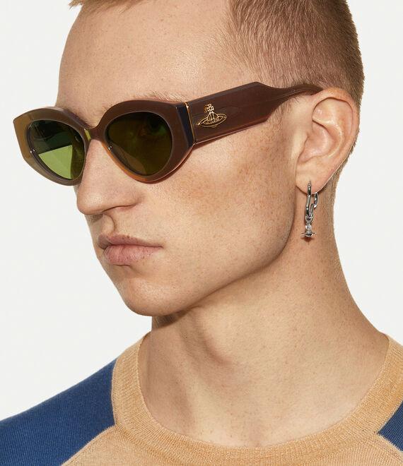 The Jackie sunglasses feature a timeless silhouette inspired by vintage photographs and candid shots of 1980s underground musicians and cultural icons. The iridescent design is complemented by tinted lenses with UV protection and a distinctive two-dimensional metal orb detail at the temples, synonymous with Vivienne's vision of launching tradition into the future.