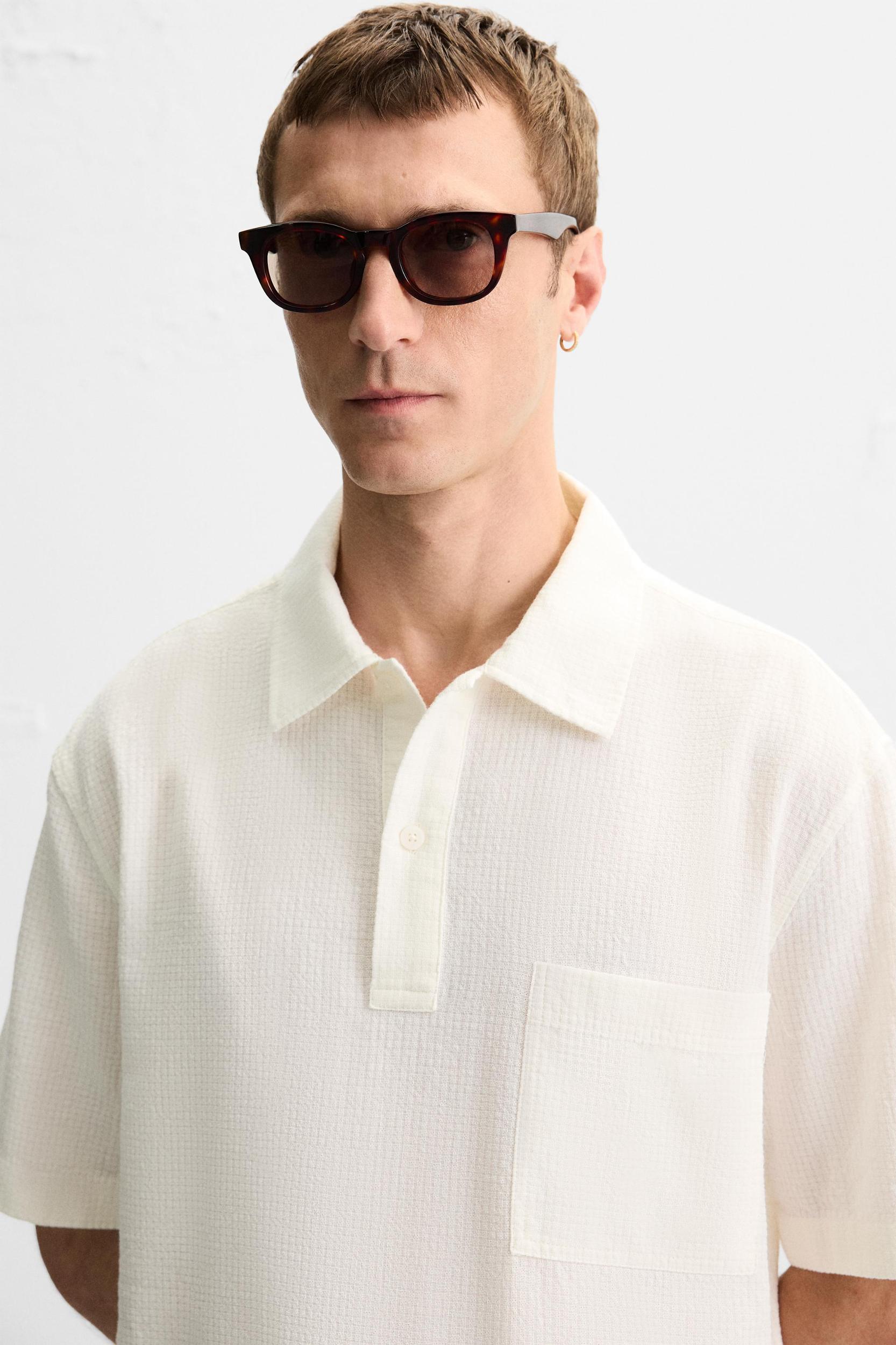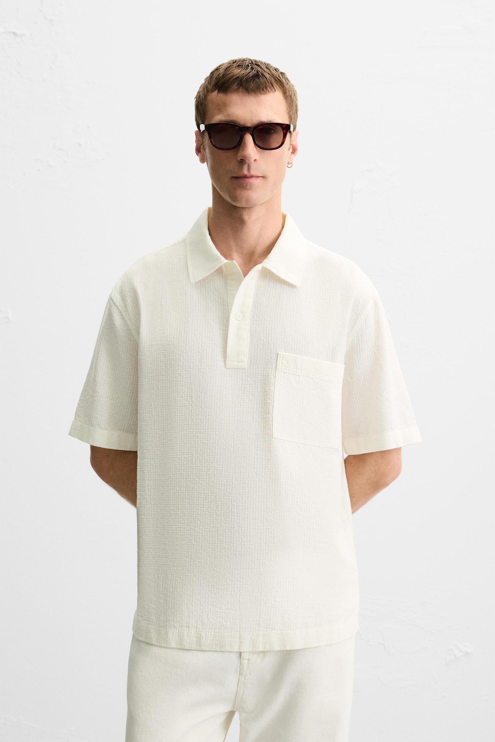 Regular fit polo shirt made of cotton fabric. Lapel collar with front button closure. Short sleeves. Patch pocket on chest. Hem with side vents.