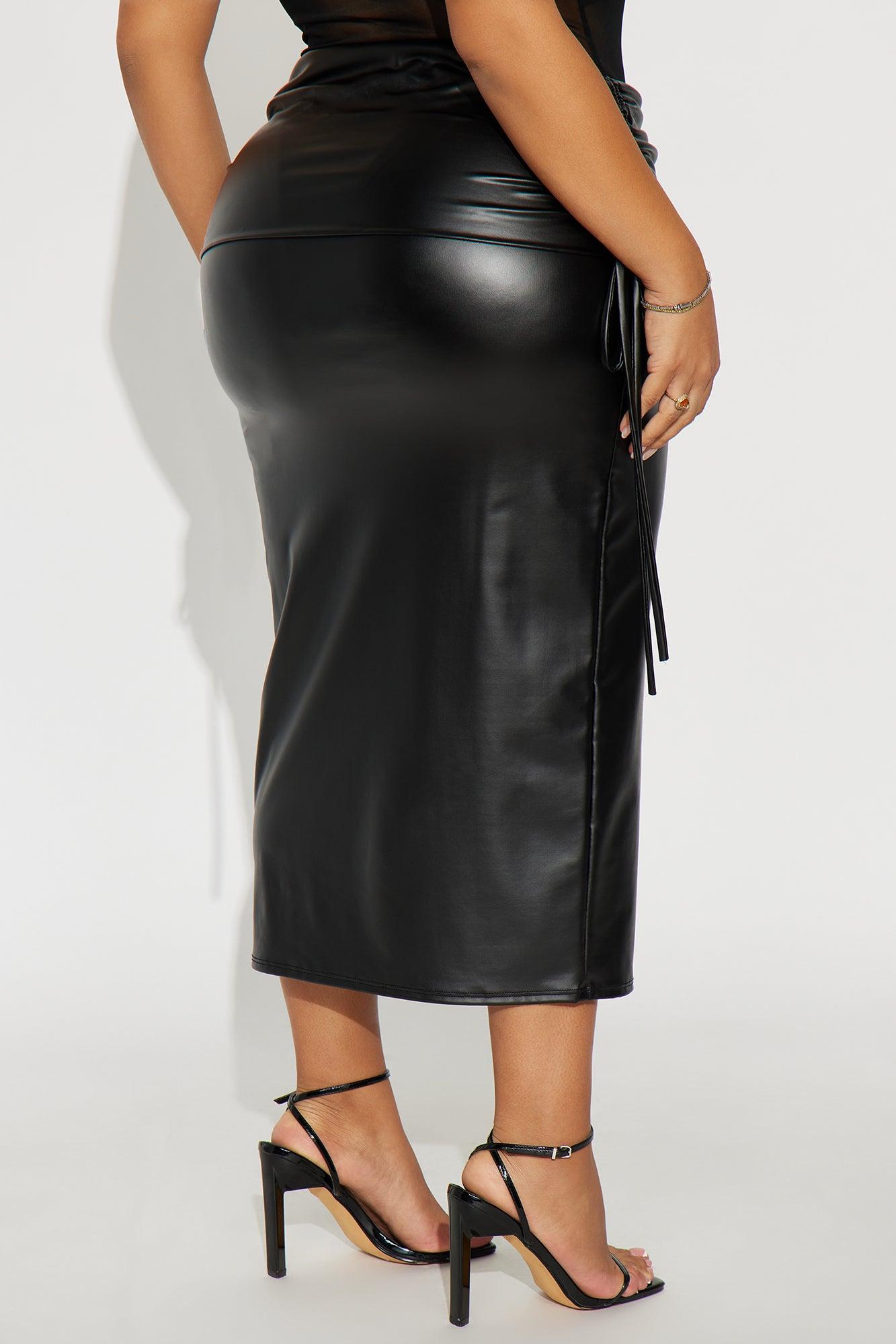 Available In Black And Red. Midi Skirt Fold Over Waistband Low Rise Ruched Side Detail Body Con Faux Leather Stretch 29" Length Self : 95% Polyester 5% Spandex Imported
