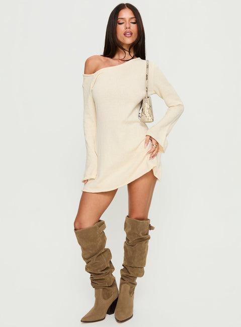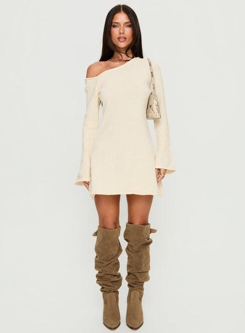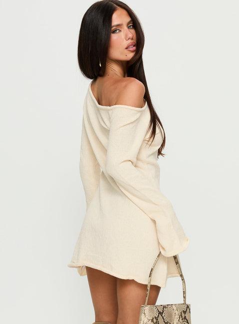 Jade Mini Dress - Long Sleeve Off Shoulder Draped Bias Cut Dress in Cream