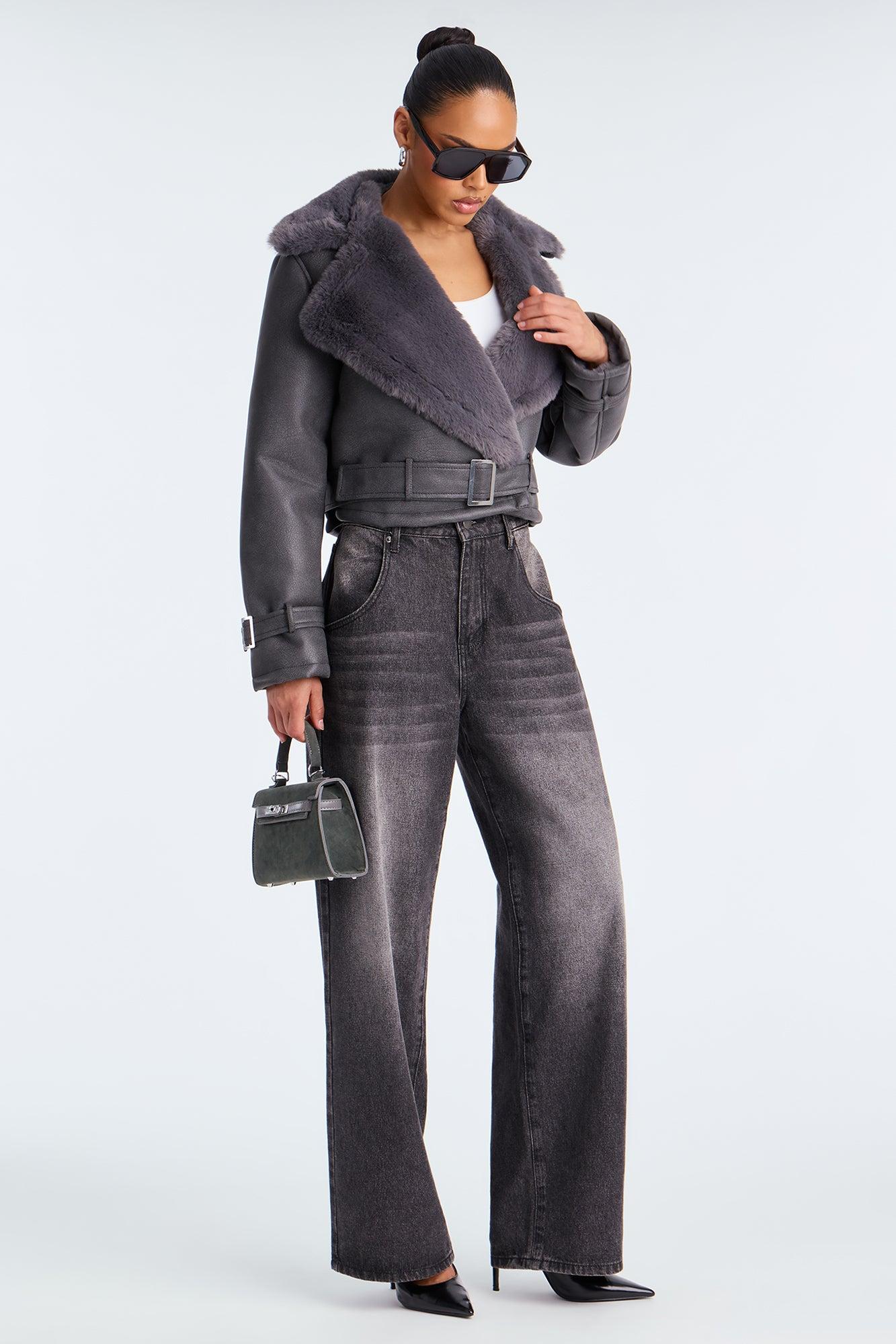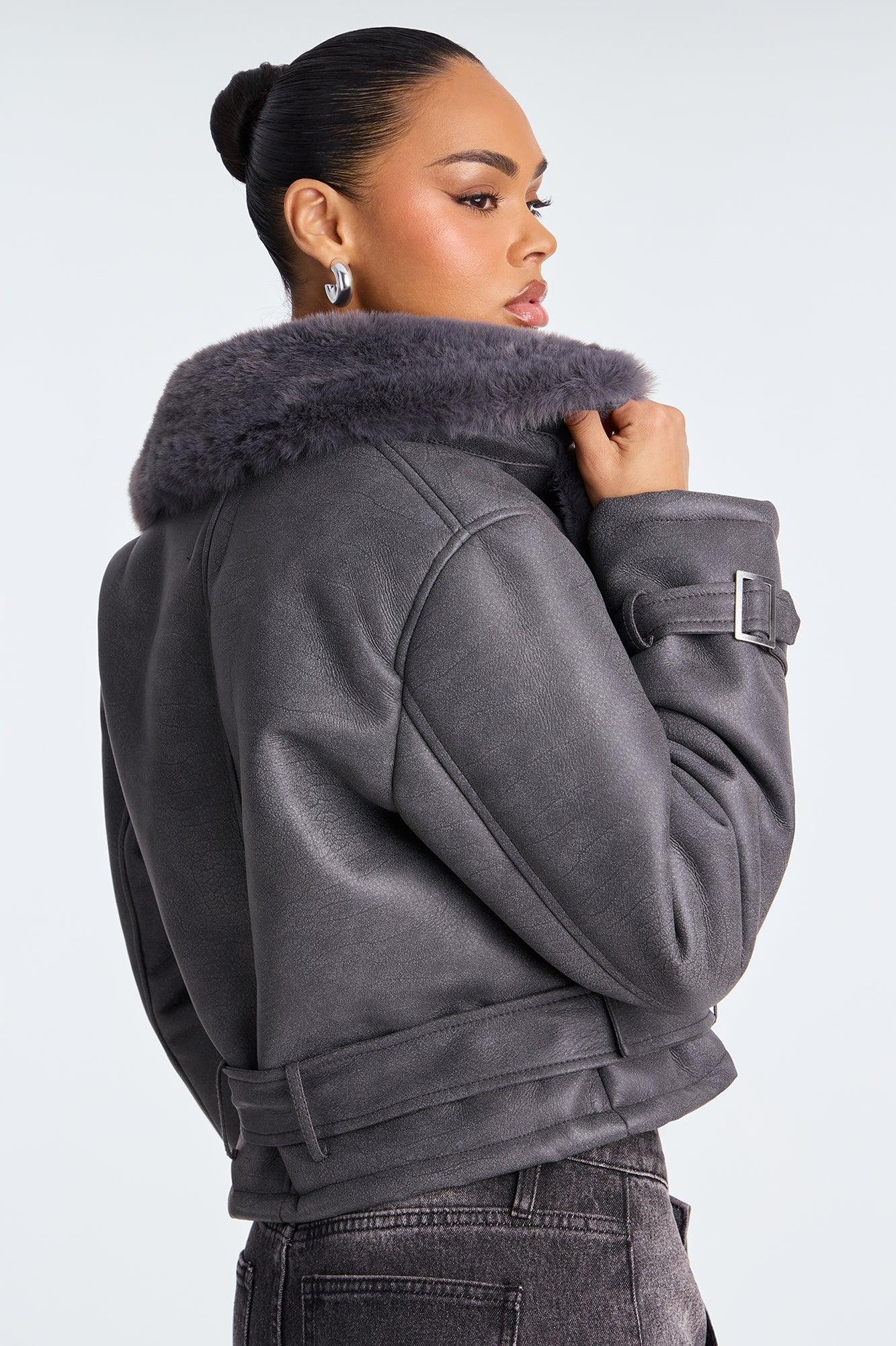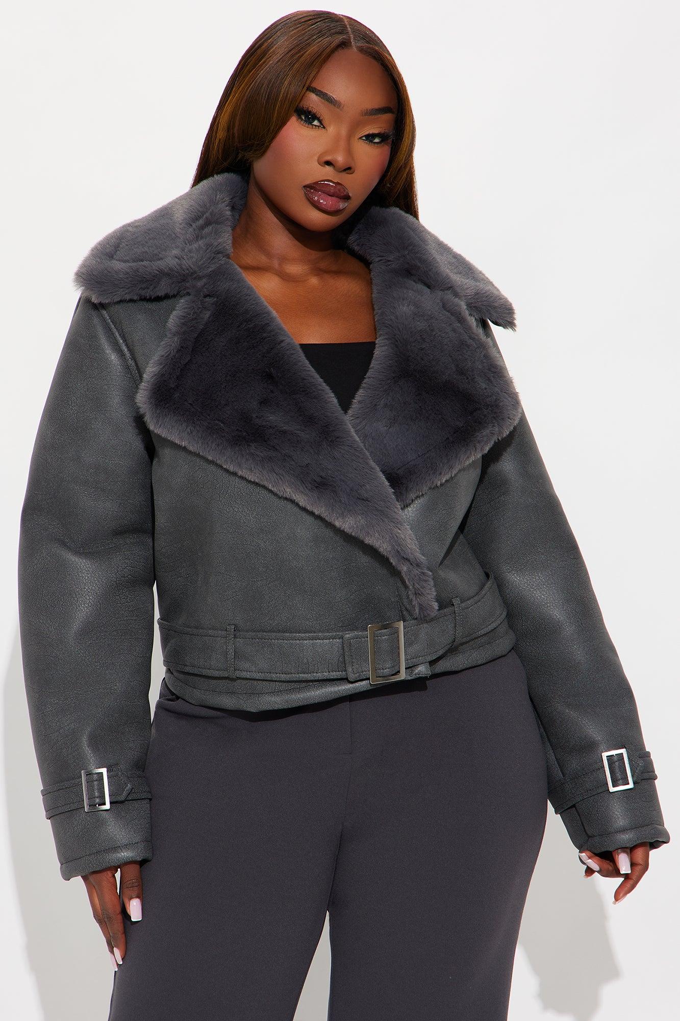 Available In Grey And Navy. Faux Leather Moto Jacket Collar Neckline W/ Fur Trim Long Sleeves Belted Button Closure Fully Fur Lined Self Coating: 100% Polyurethane Backing: 100% Polyester Faux Fur: 100% Polyester Imported California Proposition 65WARNING: Cancer and Reproductive Harm - www.P65Warnings.ca.gov.