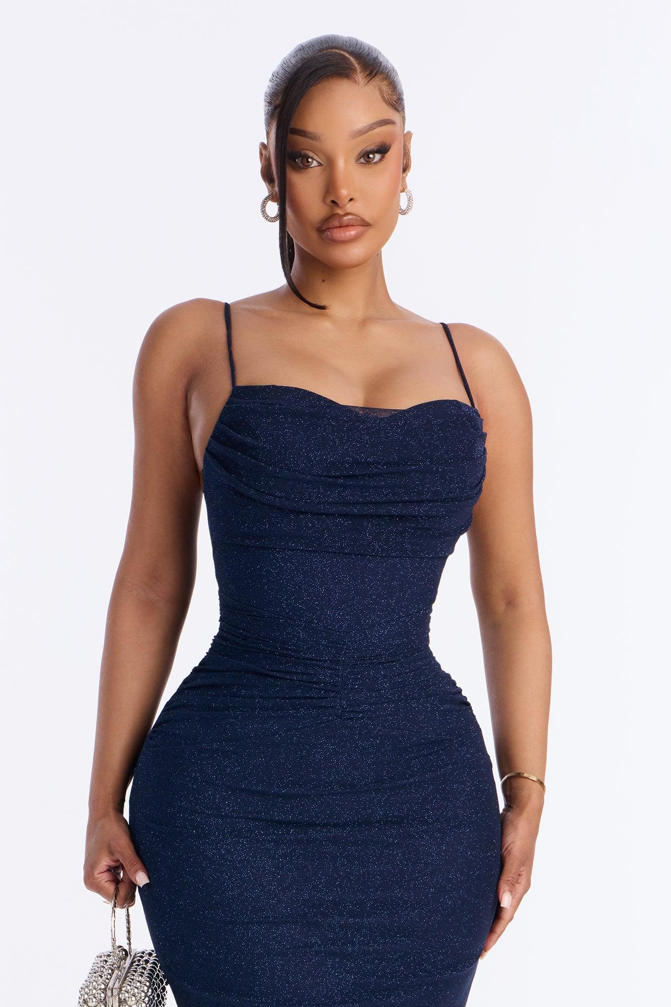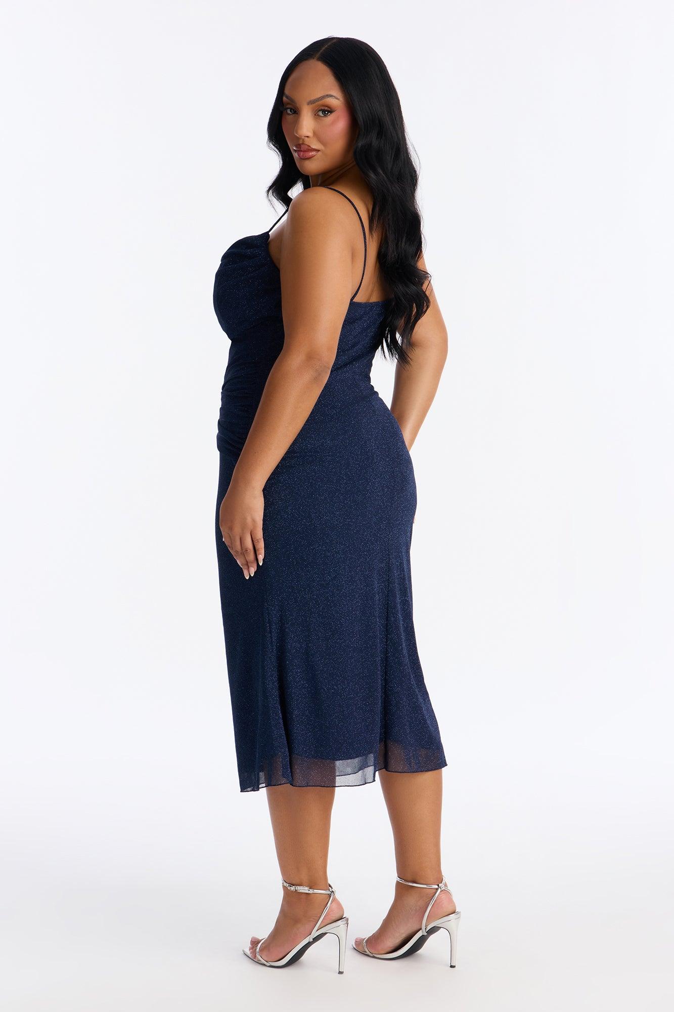 Available In Brown, Cream And Navy. Glitter Mesh Midi Dress Sweetheart Neckline Spaghetti Strap Cowl Detail Padded Bra Cups Ruched Detail Lined Stretch Length Measured Flat = 43" Disclaimer: Glitter Will Transfer Due To Glitter Application. Self: 95% Polyester 5% Spandex Lining: 100% Polyester Imported California Proposition 65WARNING: Cancer and Reproductive Harm - www.P65Warnings.ca.gov.
