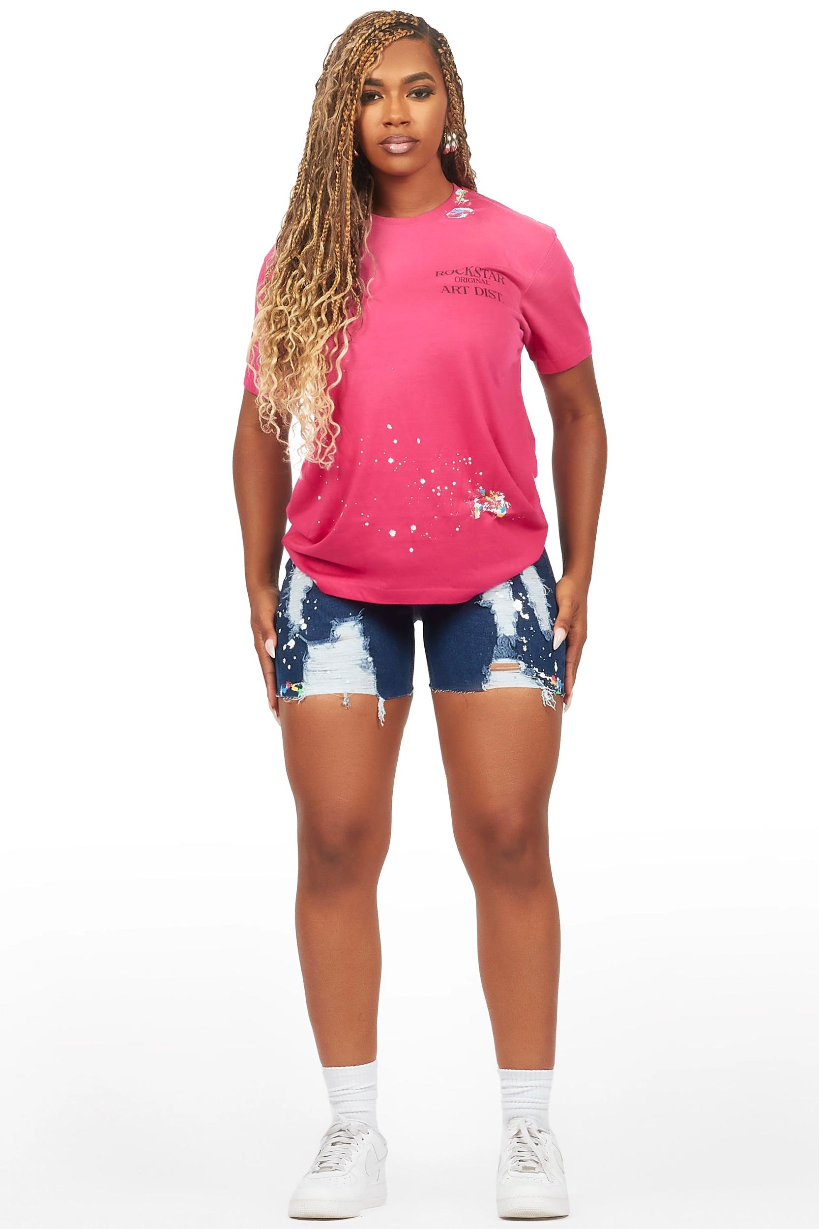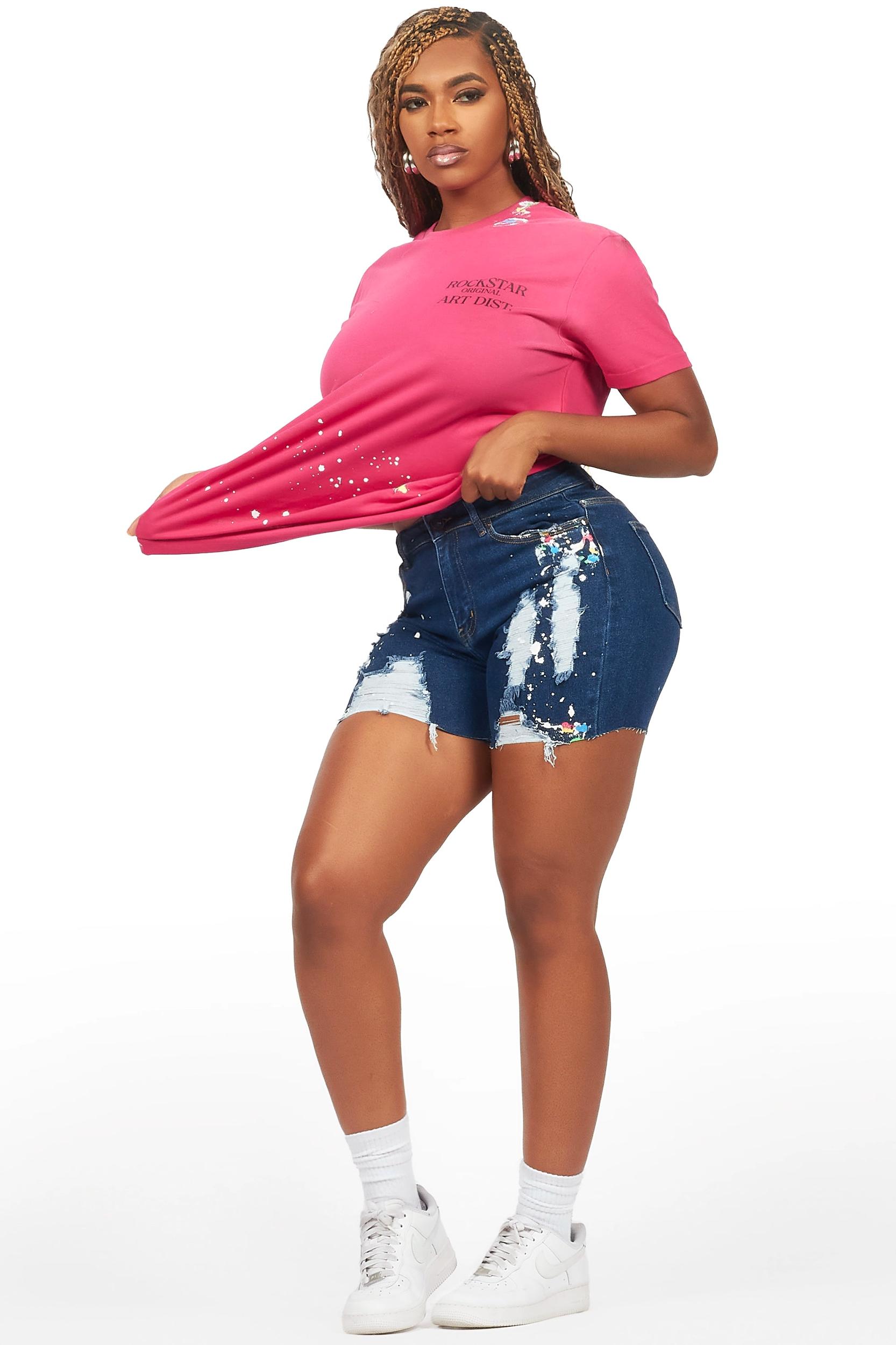 An urban two-piece graphic tee and denim short set for women. Designed with organic cotton and custom detailing for the perfect streetwear set. Rounded neckline Short sleeves Pullover style Regular-fit Zip fly with button closure 5-pocket build Form-fitting silhouette Stretch fabric Printed RSO logo Custom paint splatter