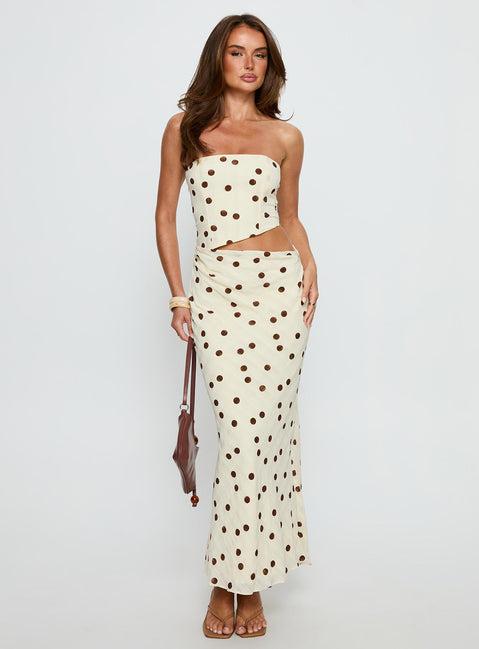 Maxi dress in a polka-dot print with a strapless neckline