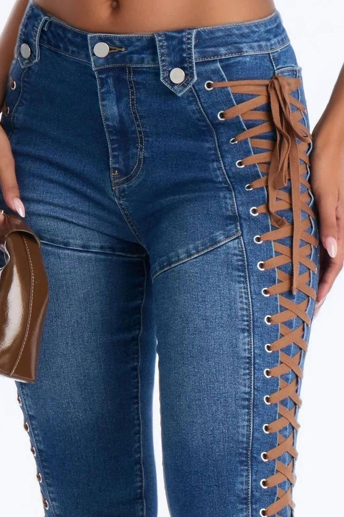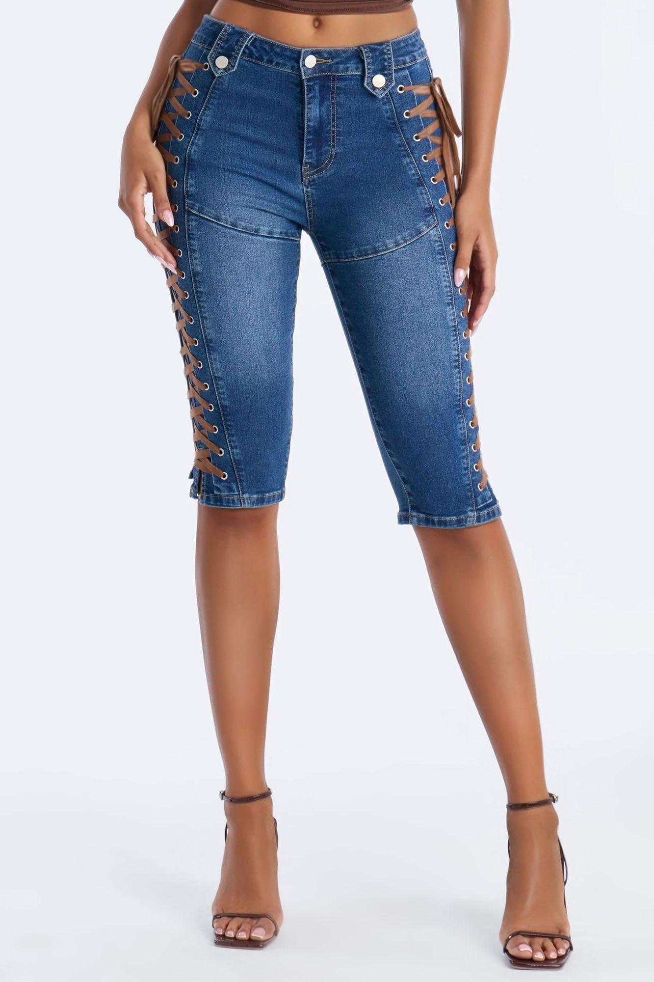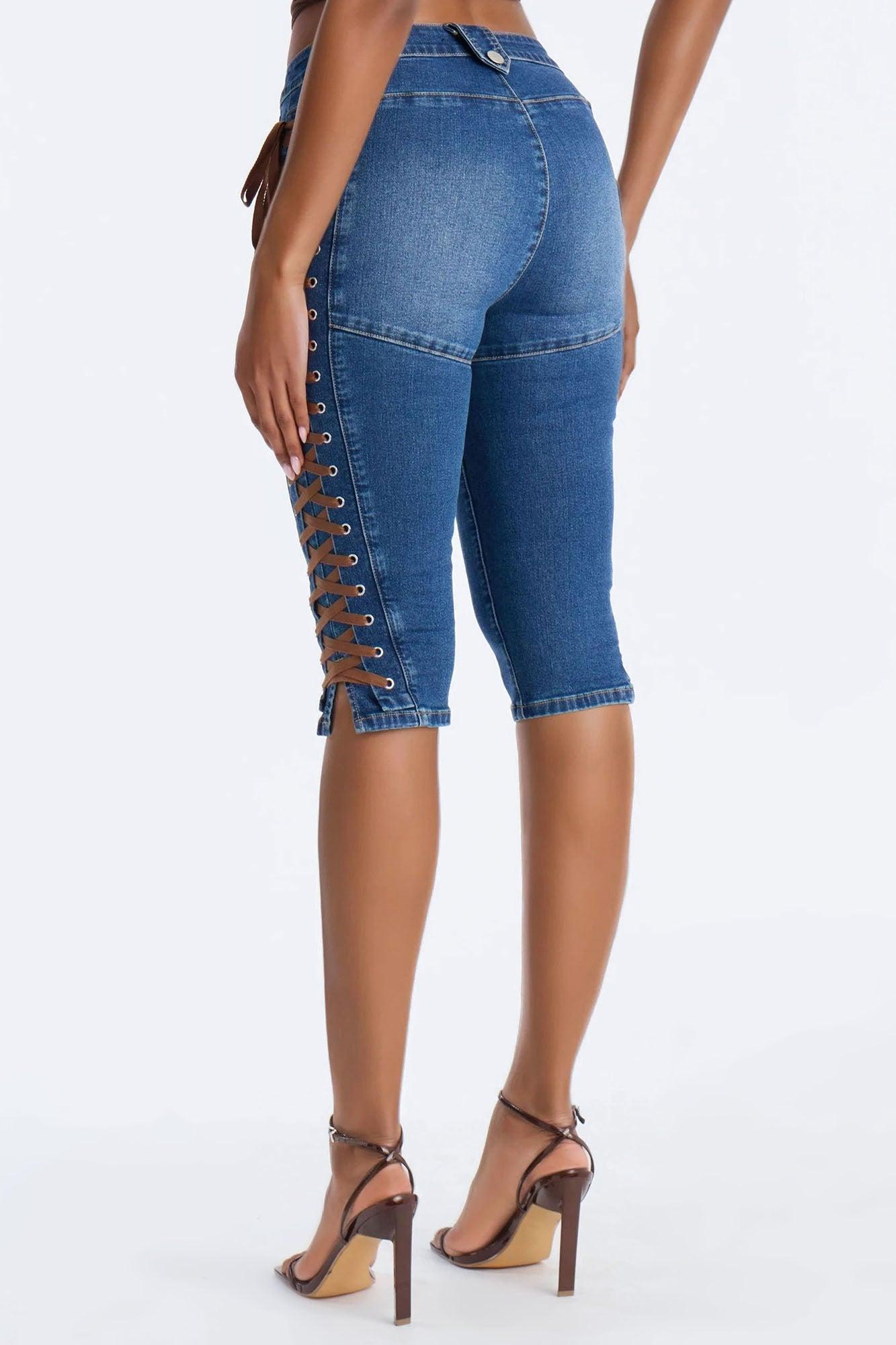 Available In Dark Wash. Skinny Jean Pedal Pusher Length Lace Up 10 1/2" Rise 16" Inseam Seaming High Stretch Disclaimer: Due To The Specialized Wash, Each Garment Is Unique. 54% Cotton 26% Polyester 18% Rayon 2% Spandex Imported California Proposition 65WARNING: Cancer and Reproductive Harm - www.P65Warnings.ca.gov.