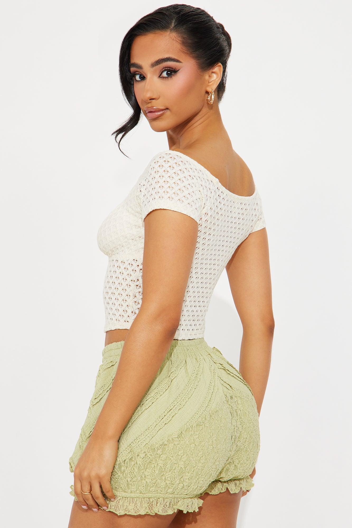 Available In Black And White. Boat Neck Top Short Sleeve Cropped Stretch Self: 58% Cotton 40% Nylon 2% Spandex Lining: 100% Polyester Imported