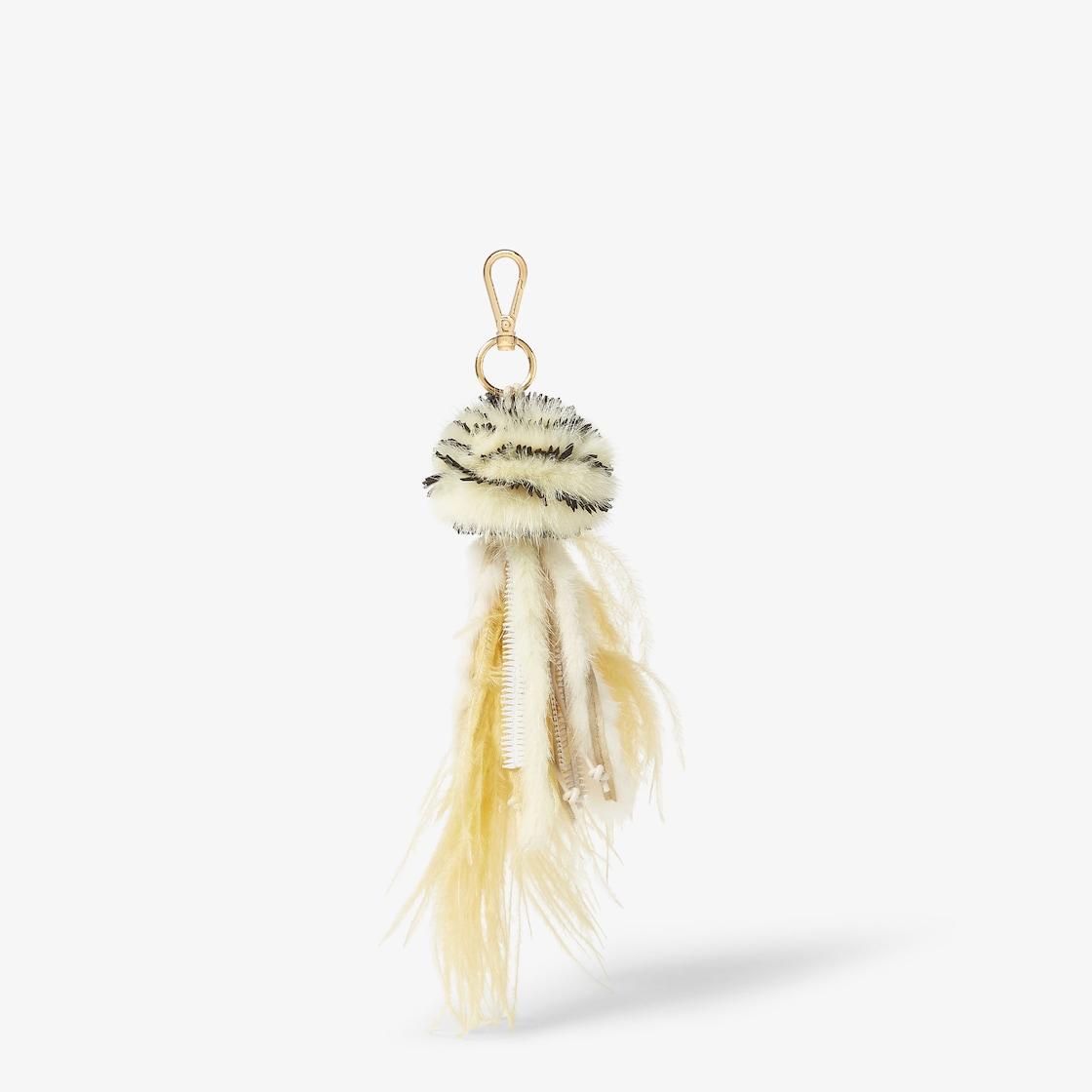 Jellyfish-shaped charm with customized Fendi logo clip and small FF logo geometric bead. Made of mink and ostrich feathers in light yellow with brown leather details. Gold-finish metalware. Perfect for customizing the look of all the collection bags. Made in Italy